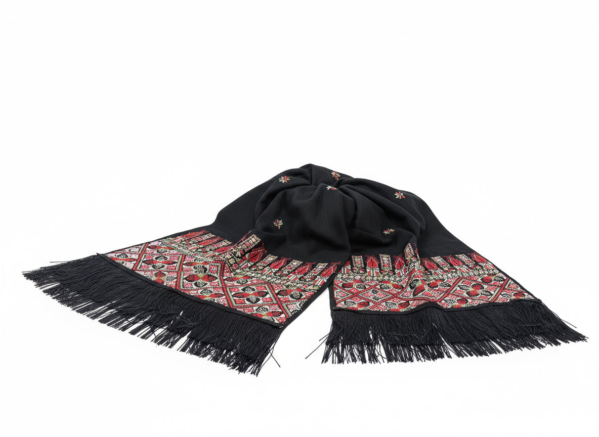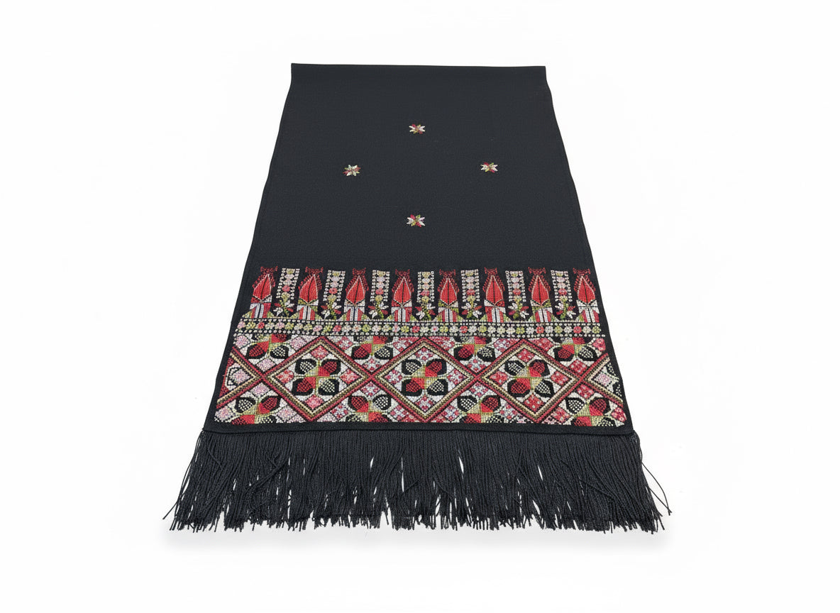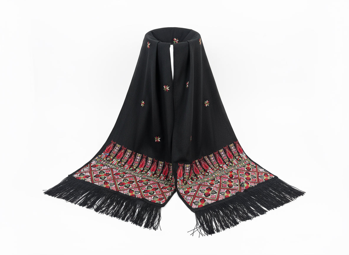 This stunning hand-embroidered black shawl, crafted by talented Palestinian women in Ramallah, blends traditional craftsmanship with a modern touch. Its intricate red & green embroidery patterns add a stylish flair and effortlessly enhance any outfit.