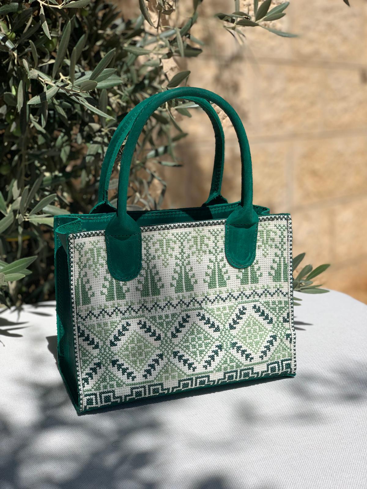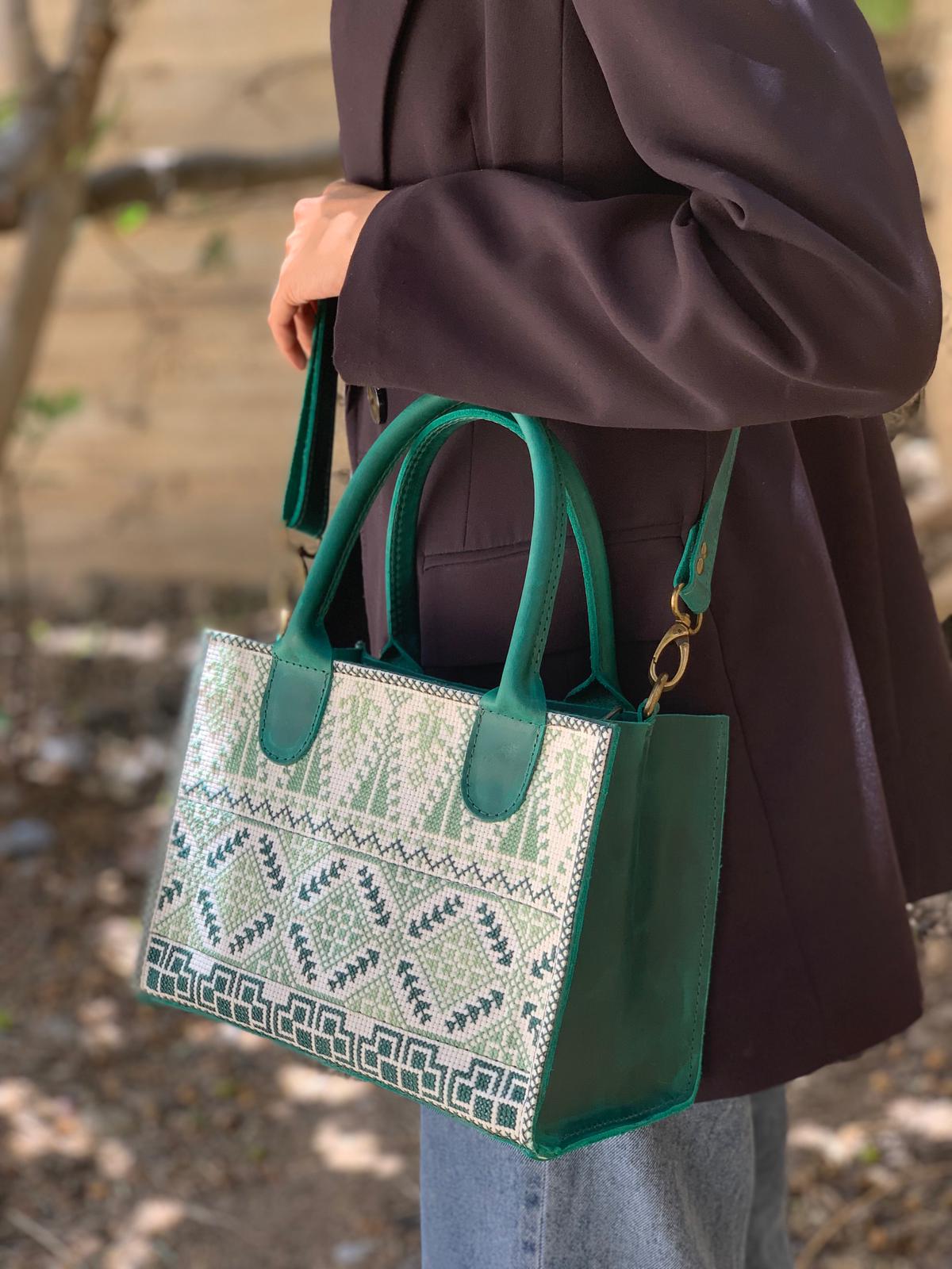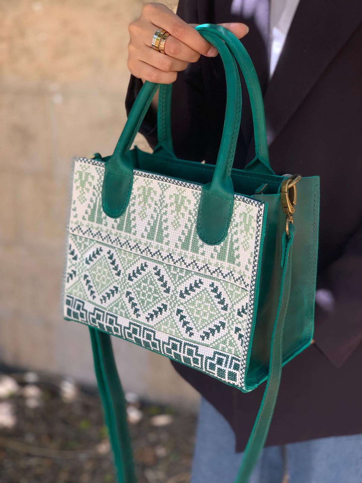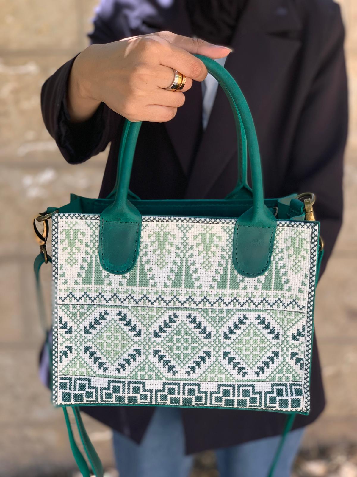 A handcrafted, mini embroidered handbag made from 100% genuine leather & hand embroidery in Hebron, this artisanal piece showcases quality craftsmanship. Equipped with a durable zipper to keep your belongings secure, along with a long, detachable, and adjustable strap.