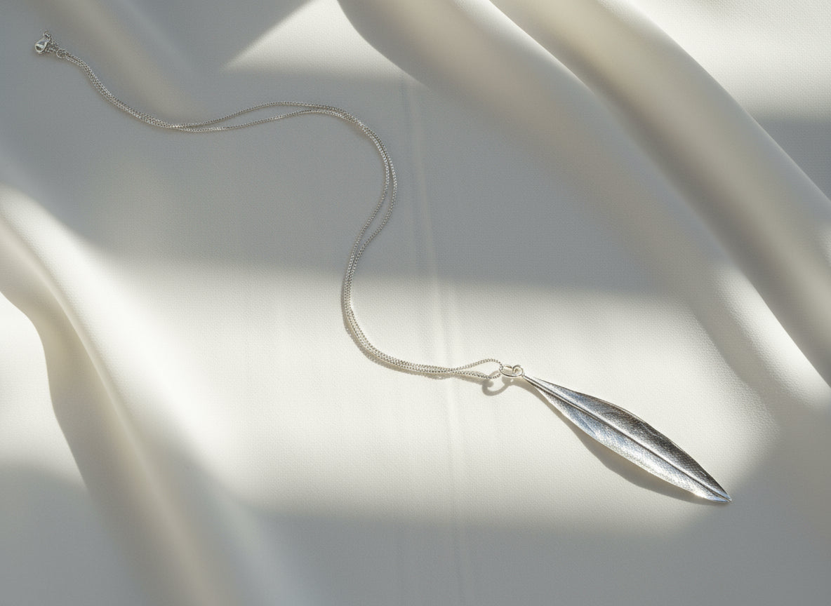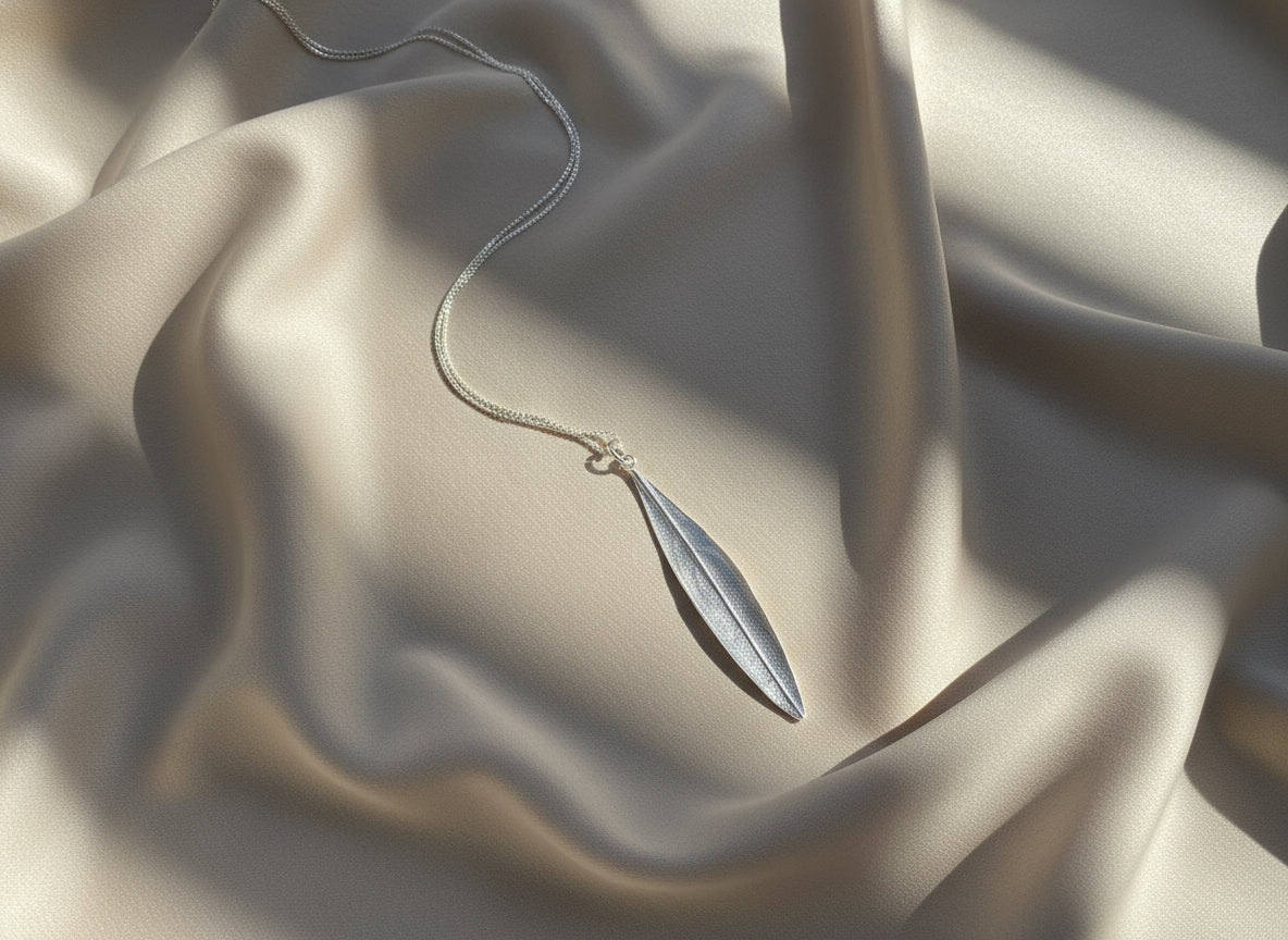 Handmade silver olive leaf pendant, exquisitely crafted from delicate leaves by the esteemed Palestinian jewelry designer Nadia Abu Ghattas. A native of Beit Jala, Bethlehem, her pieces draw inspiration from the iconic Palestinian olive tree, which for Nadia represents steadfastness and resilience.