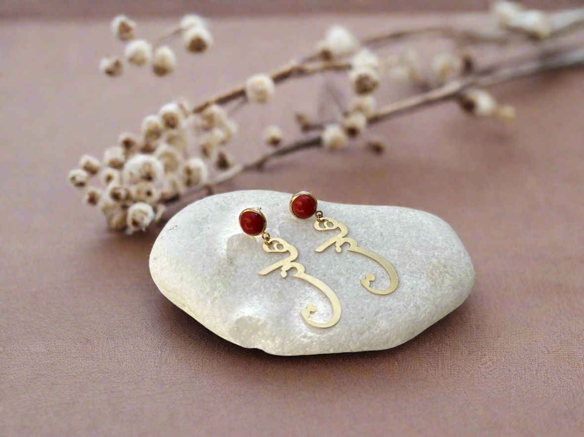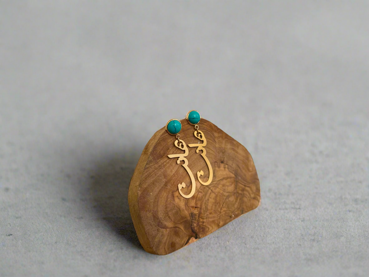 Gold plated Arabic calligraphy earrings with natural stone inlay.
