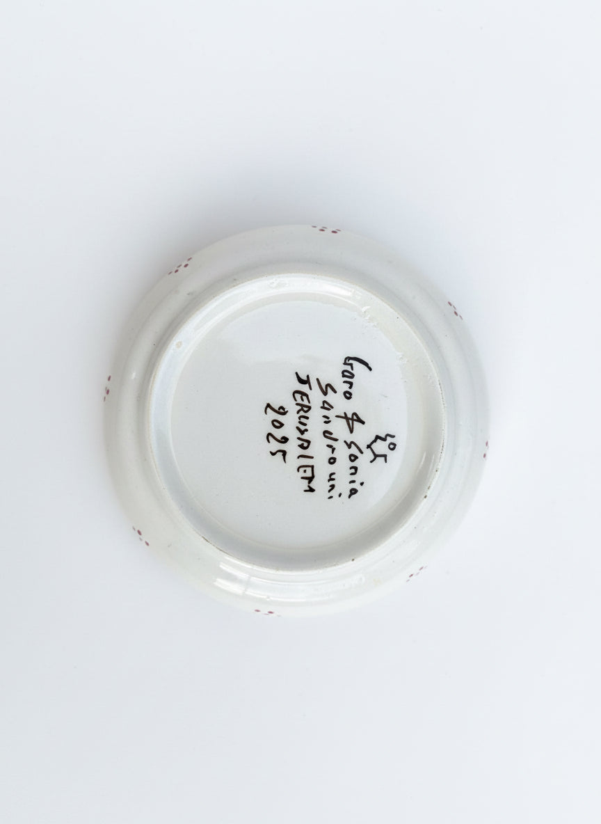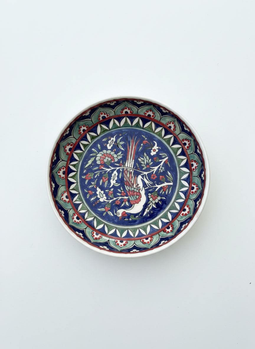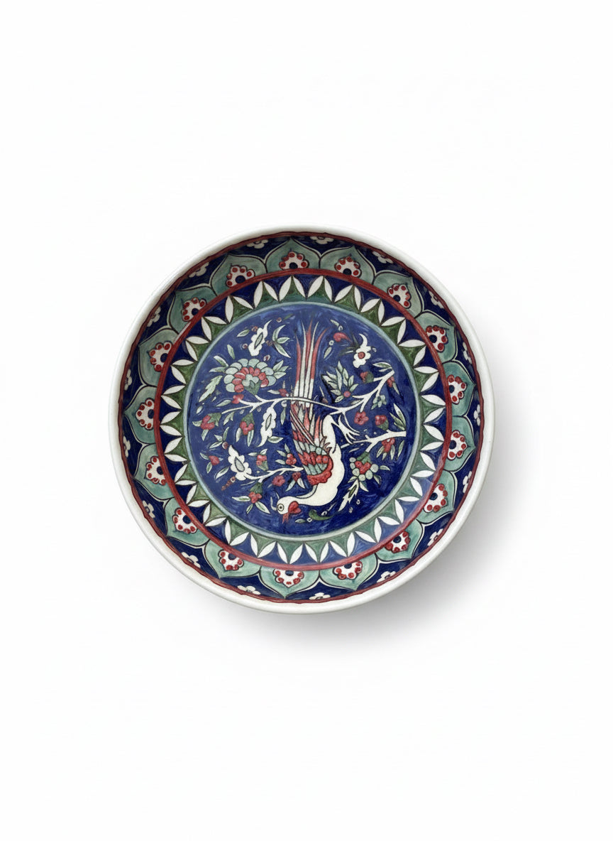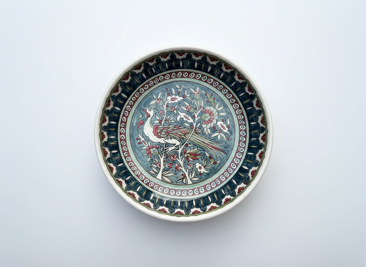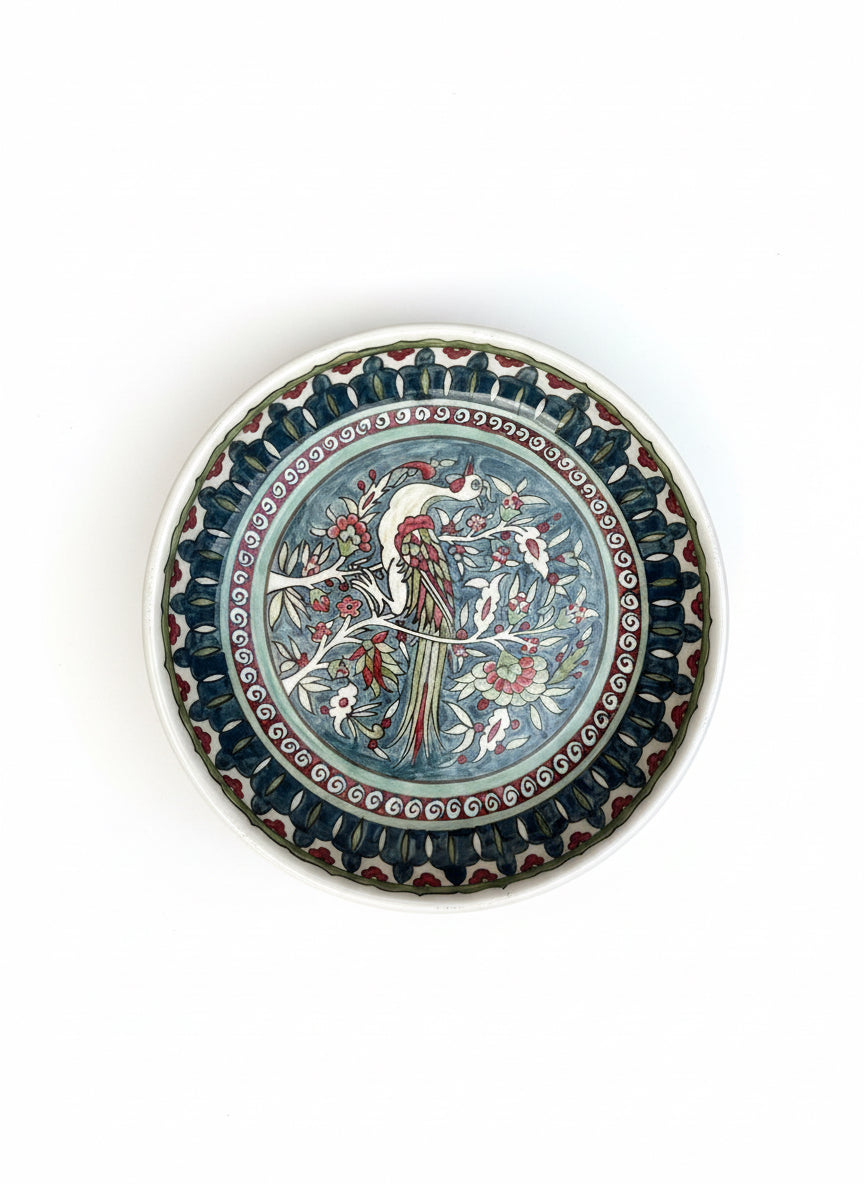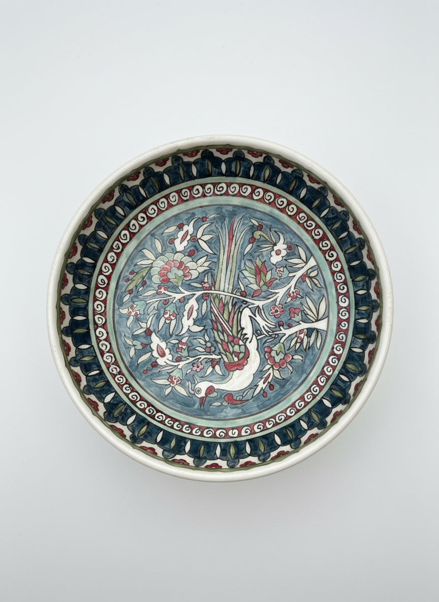 Hand-painted ceramic bowl with an intricate bird design by Jerusalem-based Armenian ceramic studio of Garo and Sonia Sandrouni.