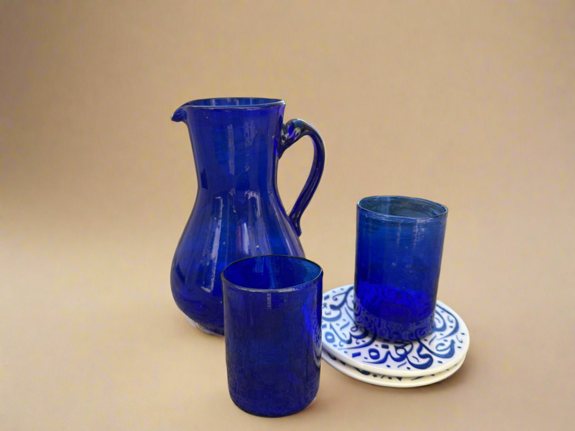 A stunning cobalt blue bundle that features exquisite craftsmanship and beautiful handmade Palestinian pieces. This set includes a handblown glass mini pitcher from Hebron, accompanied by two short tumblers. Also two ceramic calligraphy coasters that beautifully display the renowned quote by Mahmoud Darwish: “We have on this land that which makes this life worth living.” These coasters can also be hung on the wall, transforming them into striking decorative pieces.