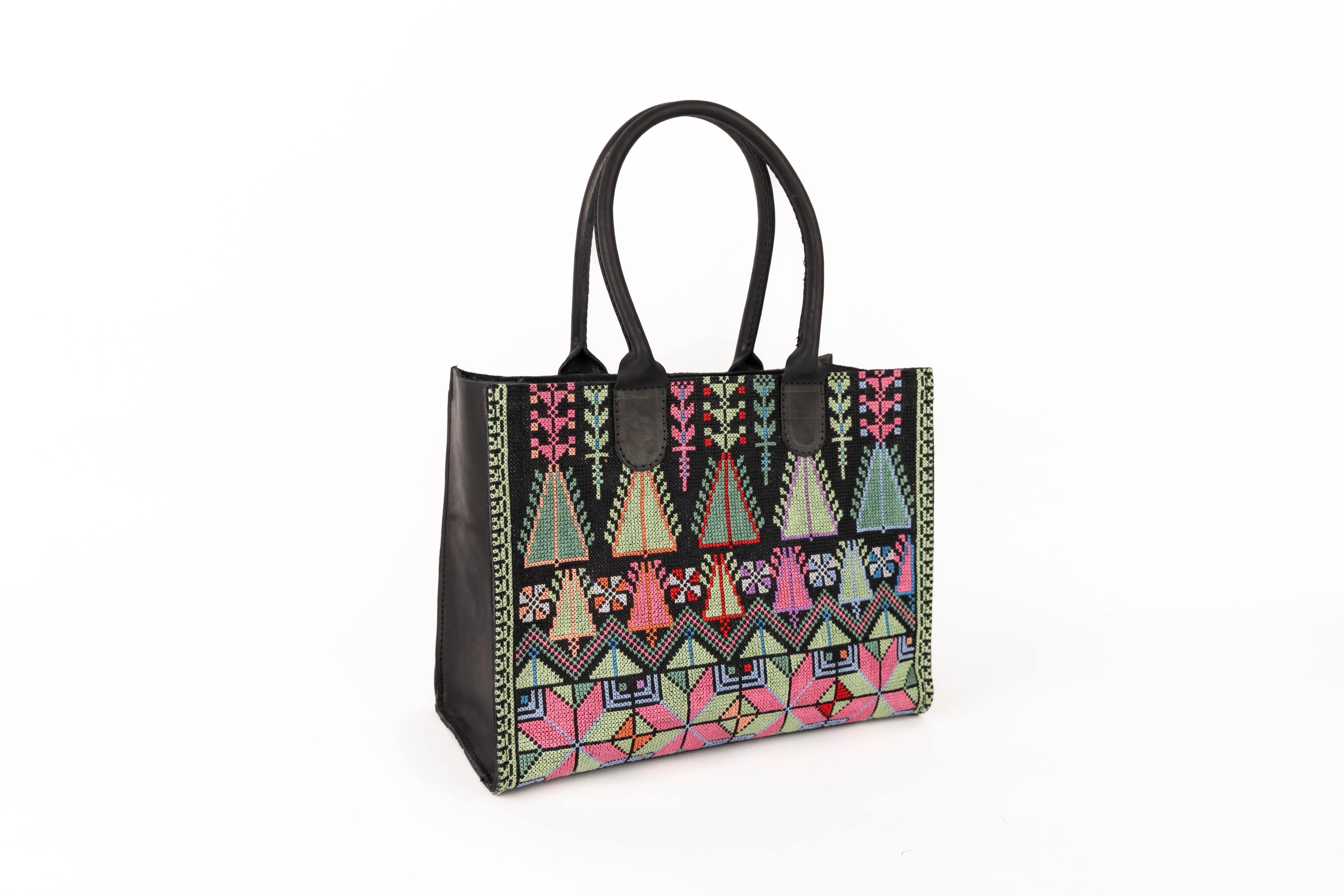 A handcrafted, medium-sized leather bag featuring both a secure zip and magnetic closure for added convenience. Made from 100% genuine leather & hand embroidered on the front side of the bag all made in Hebron, this artisanal piece showcases quality craftsmanship. It also comes with a matching small pouch for extra versatility.