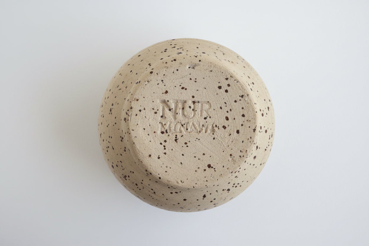 The cups are are hand-thrown ceramic cups with a clean, minimal shape. They have softly rounded walls and a slightly curved base that makes them sit comfortably in the hand. Each cup is shaped on the wheel by third-generation Palestinian ceramicist Nur Minawi in his Jaffa studio, using speckled white clay and finished with a clean white glaze.