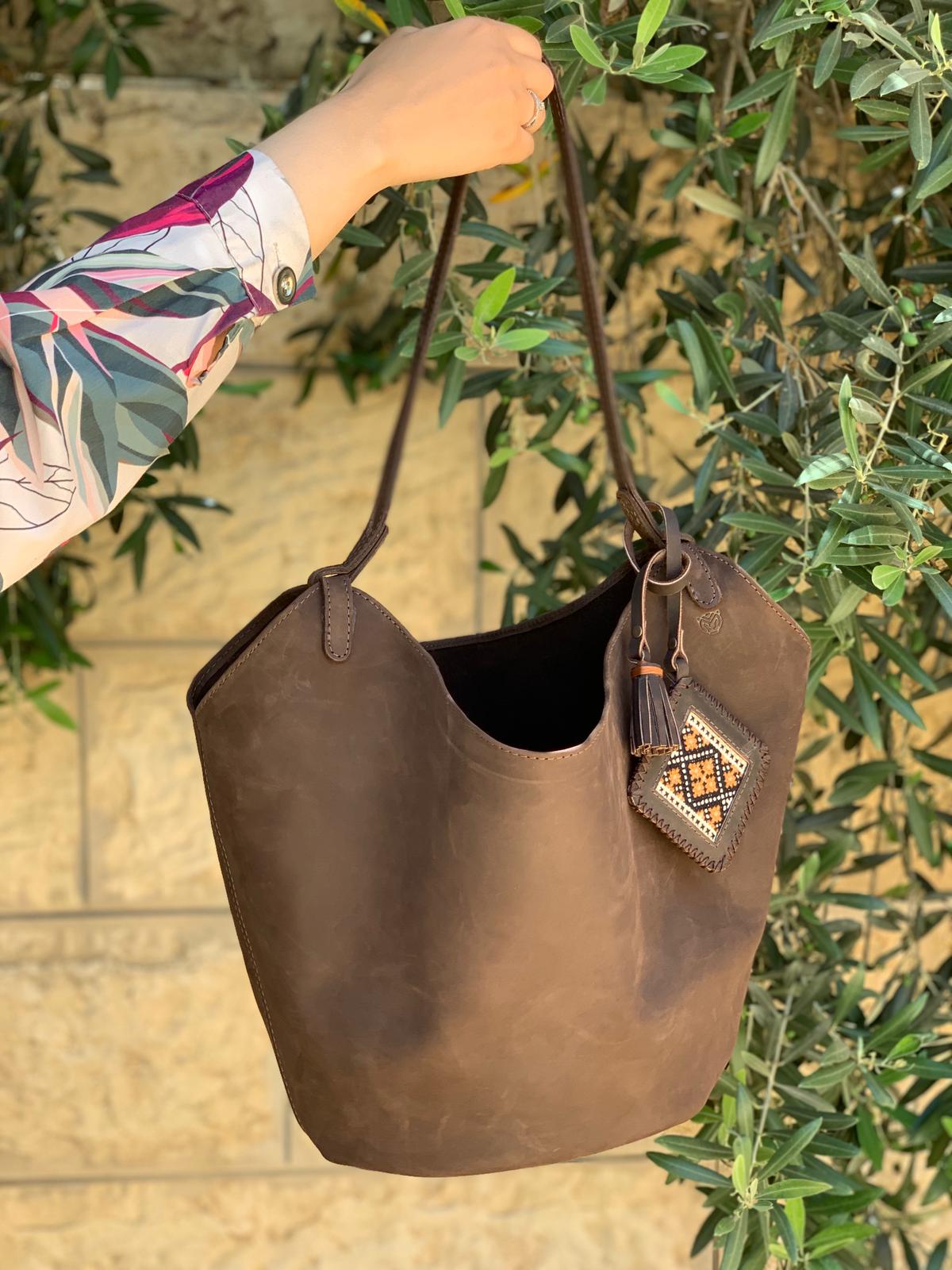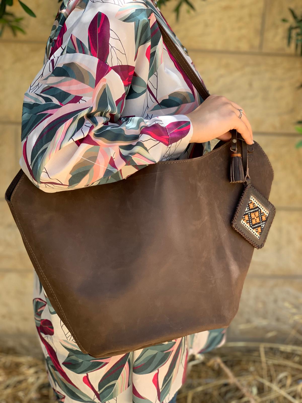 A handbag made of 100% genuine leather with elegant hand embroidered accessory, expertly crafted by Palestinian artisans. It features a magnetic closure to keep your belongings secure, and includes an inner small bag to help you organize your essentials.