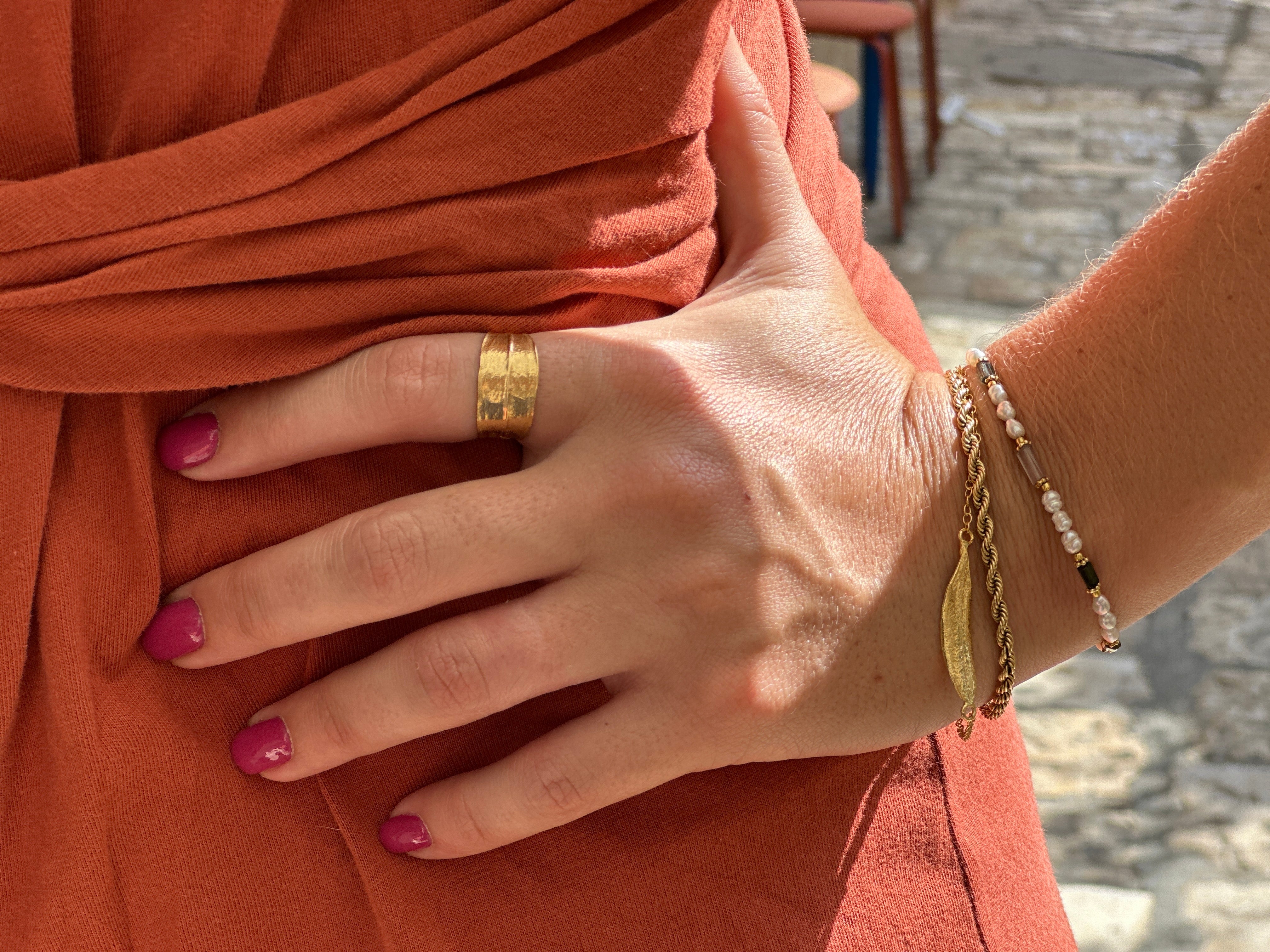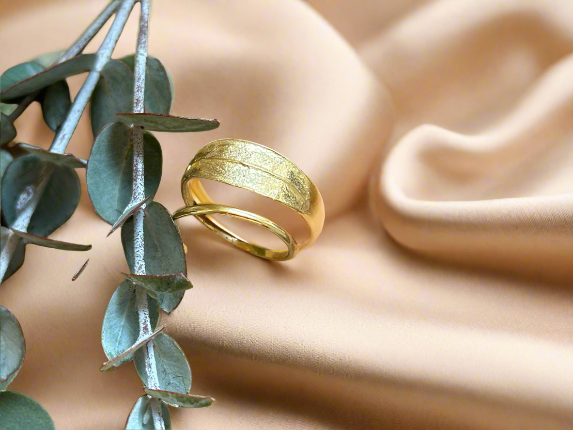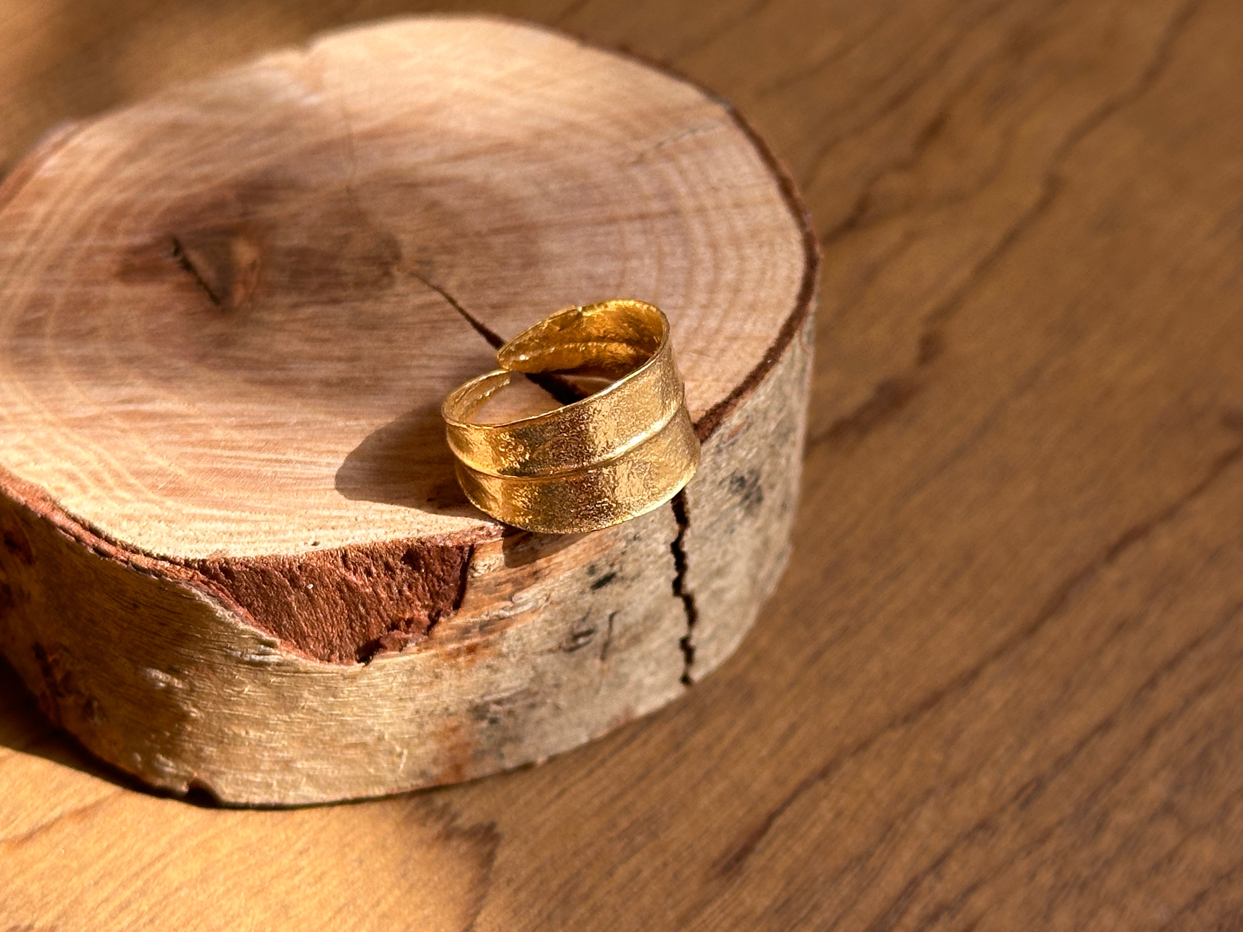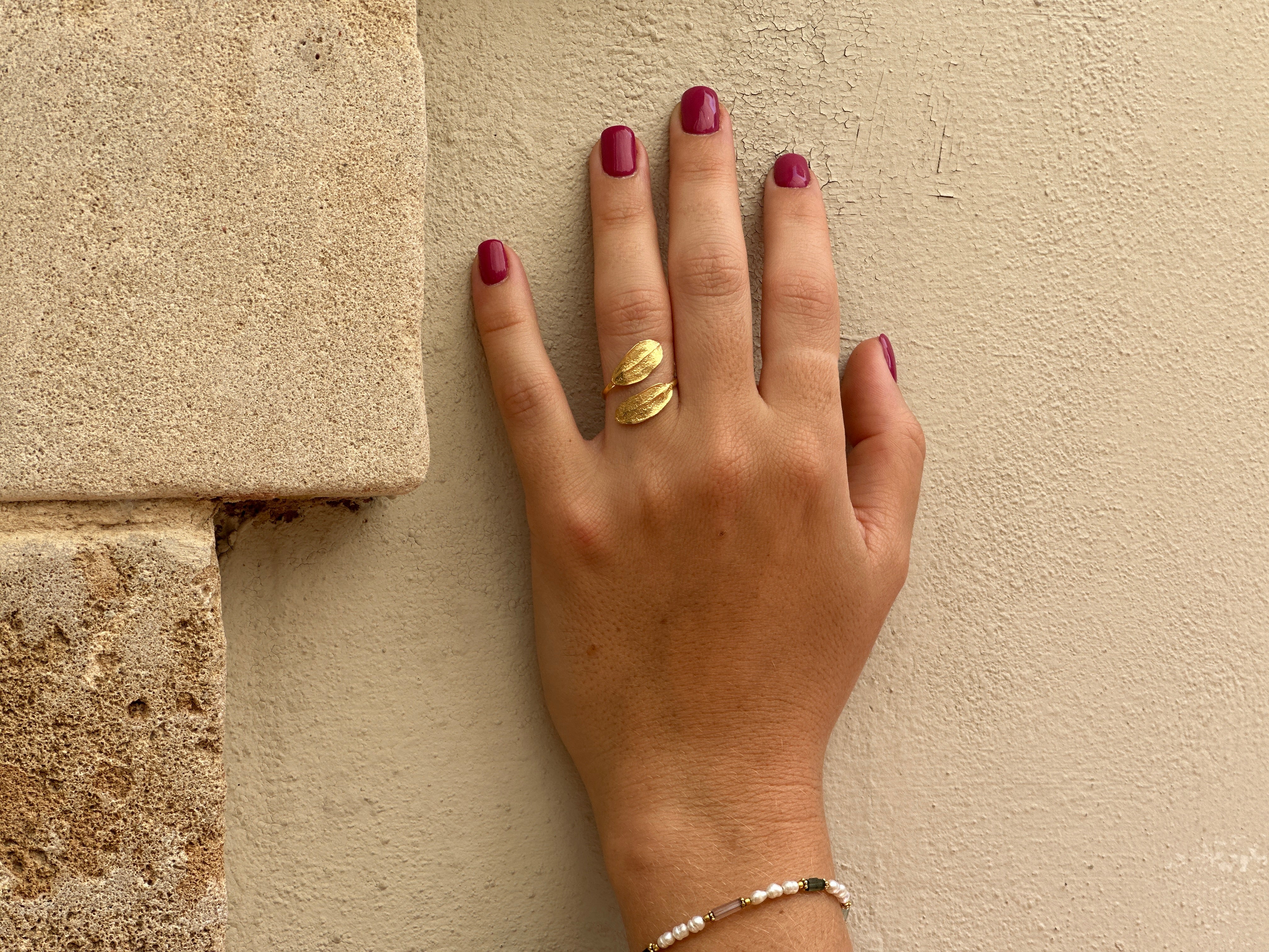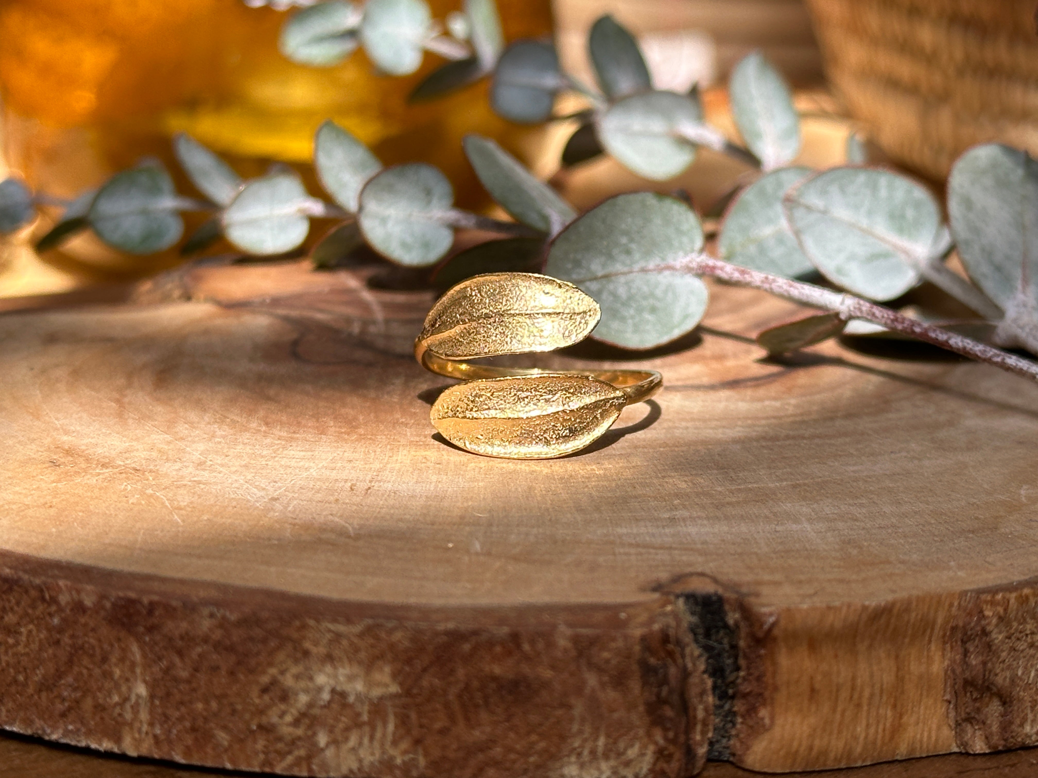 One of a kind gold olive leaf ring handmade in Bethlehem. Each gold olive leaf piece is unique, with no two alike. The leaves are handpicked and delicately attached to a wax column, then coated in gypsum to create a detailed mold. This process ensures that every piece is one of a kind.