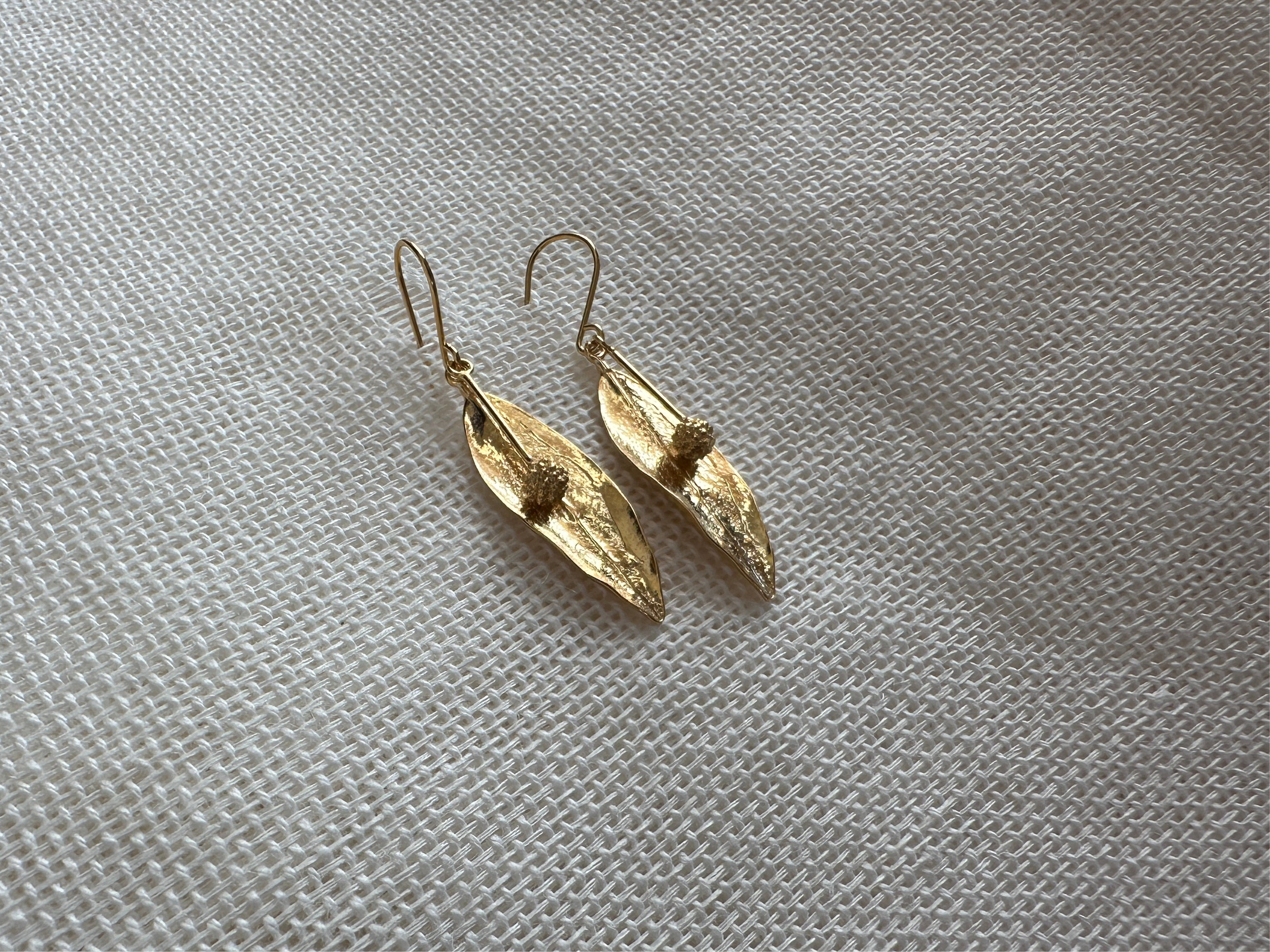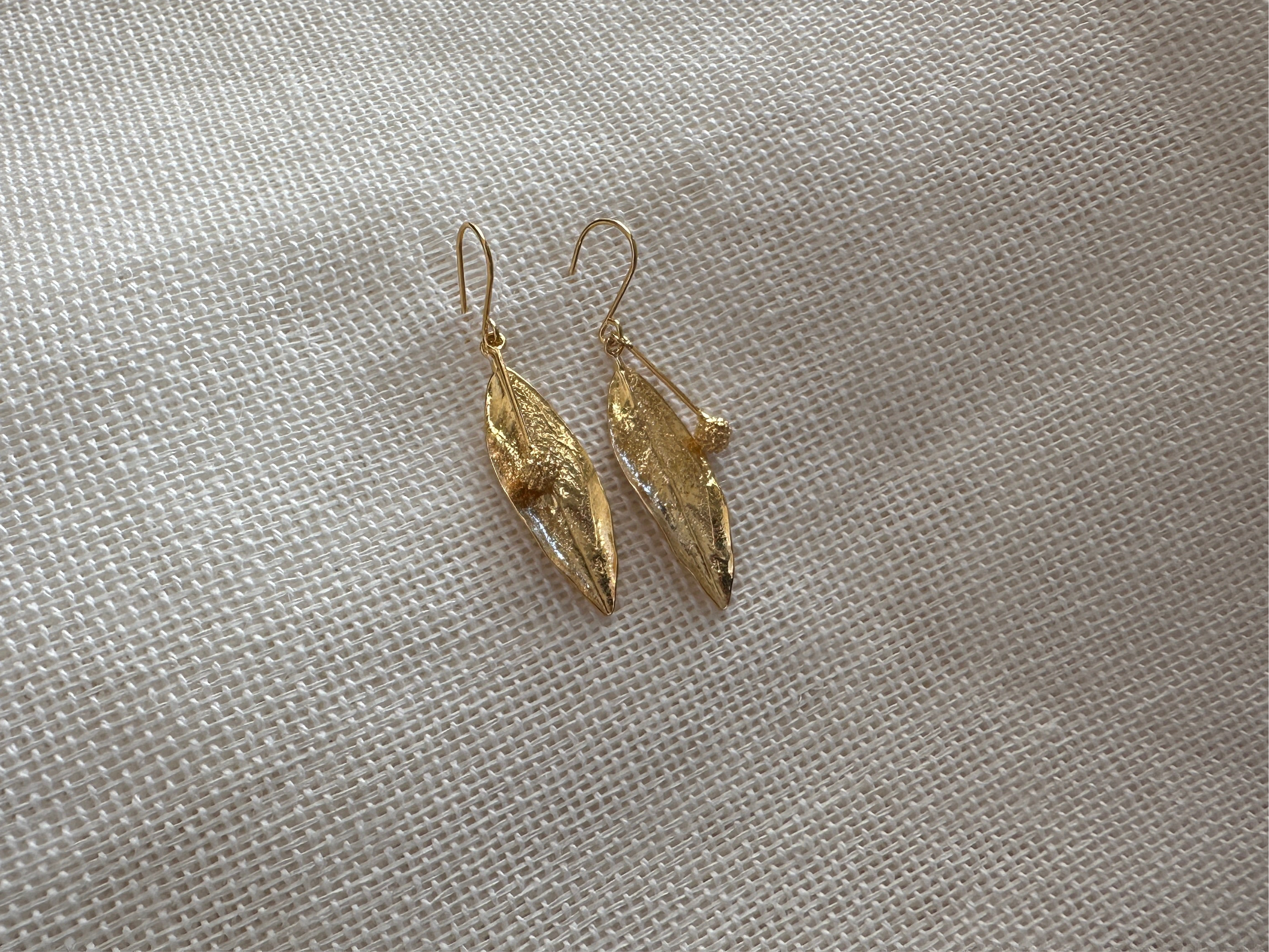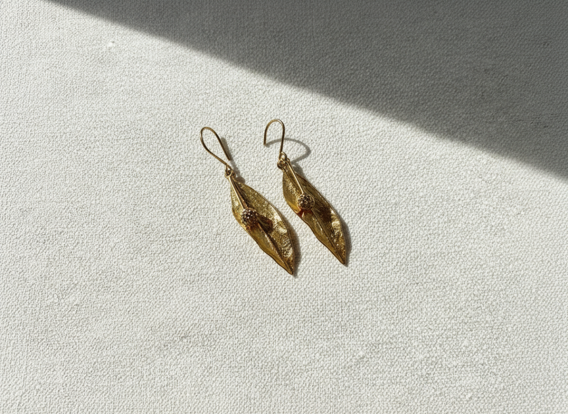 Luxurious handmade gold plated necklace, exquisitely crafted from two delicate leaves with pollen detail by the esteemed Palestinian jewelry designer Nadia Abu Ghattas. A native of Beit Jala, Bethlehem, her pieces draw inspiration from the iconic Palestinian olive tree, which for Nadia represents steadfastness and resilience.