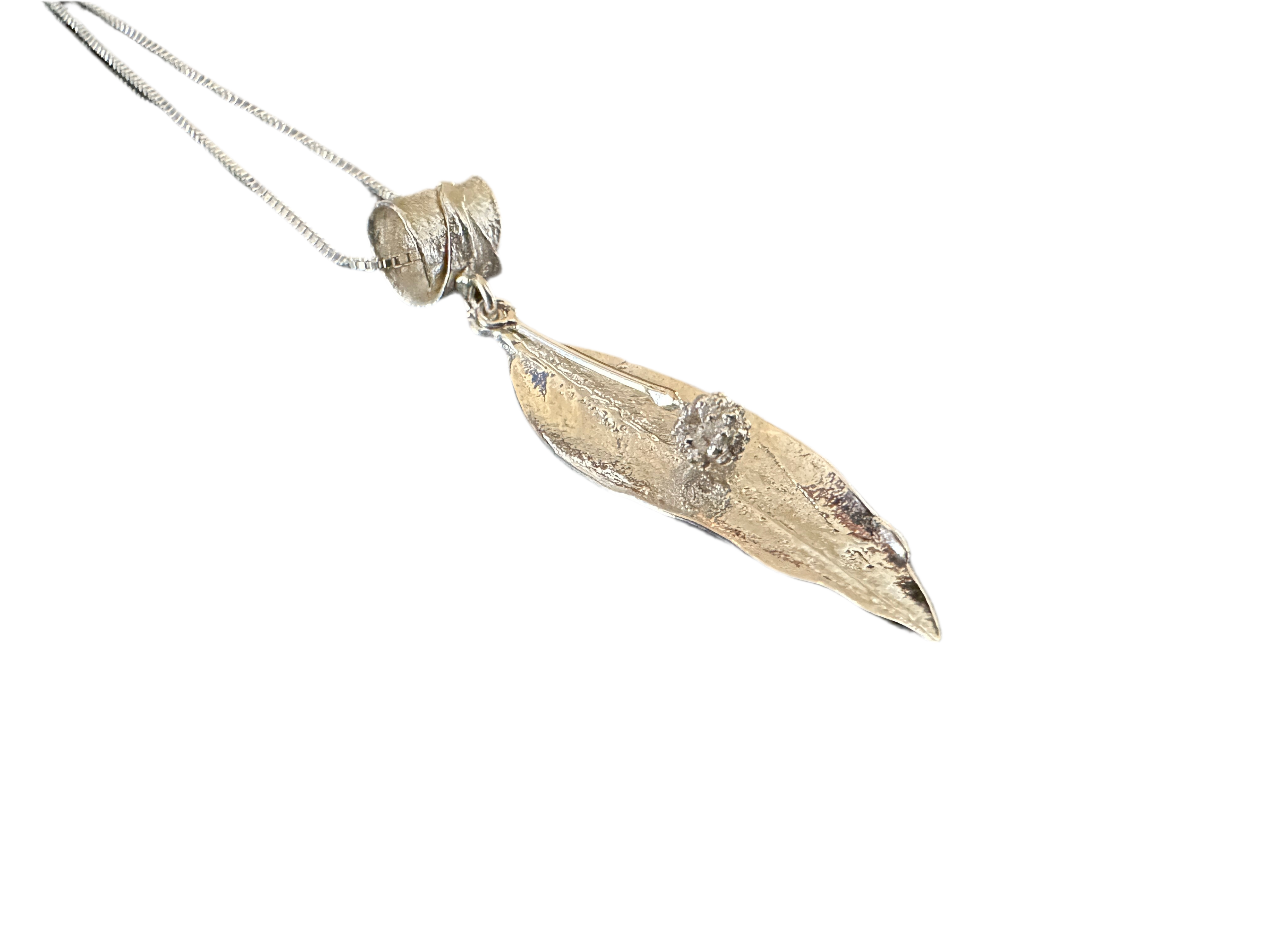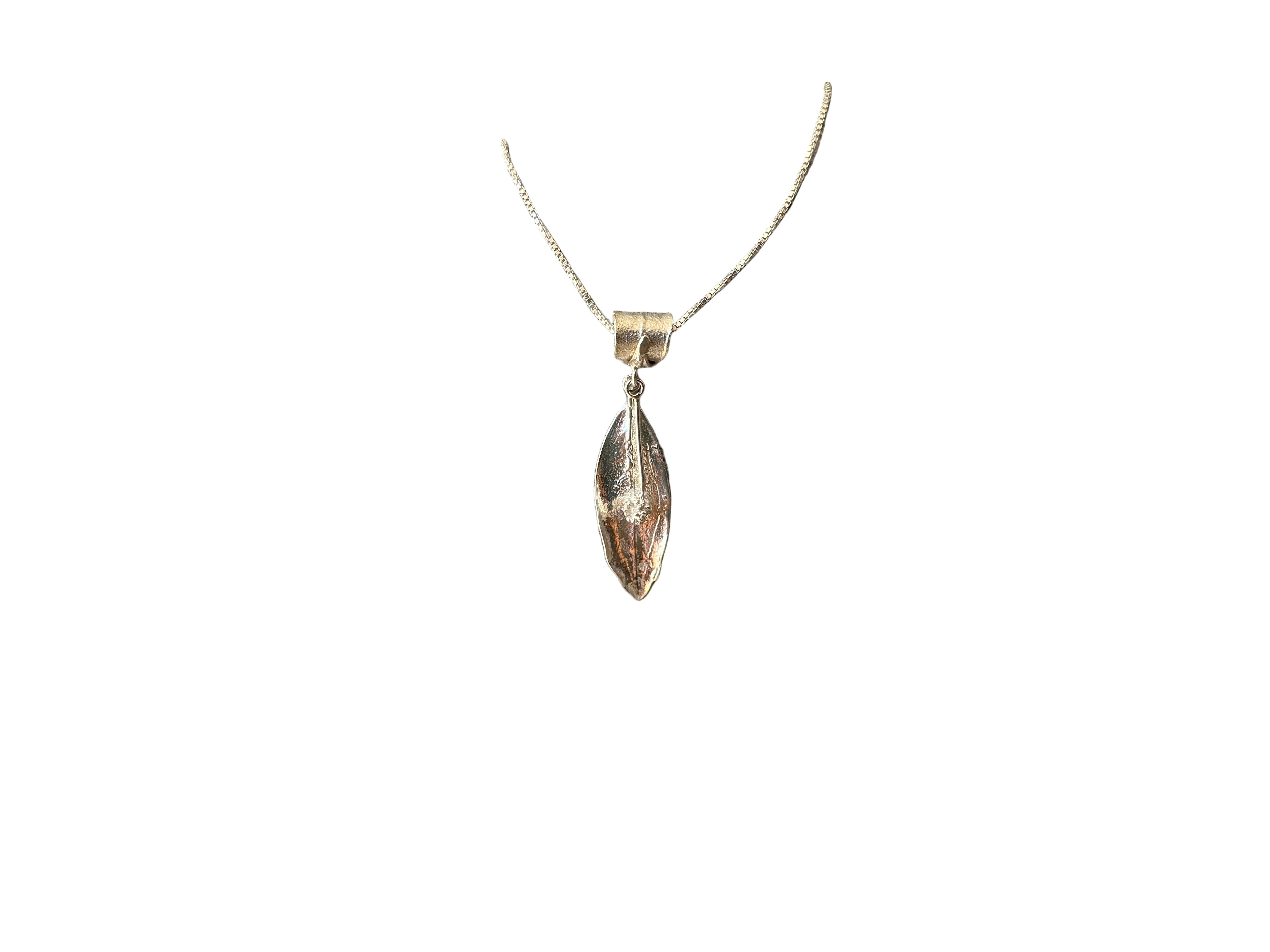 Luxurious handmade silver necklace, exquisitely crafted from two delicate leaves with pollen detail by the esteemed Palestinian jewelry designer Nadia Abu Ghattas. A native of Beit Jala, Bethlehem, her pieces draw inspiration from the iconic Palestinian olive tree, which for Nadia represents steadfastness and resilience.