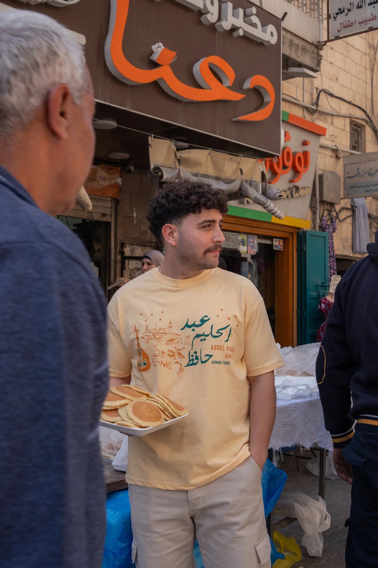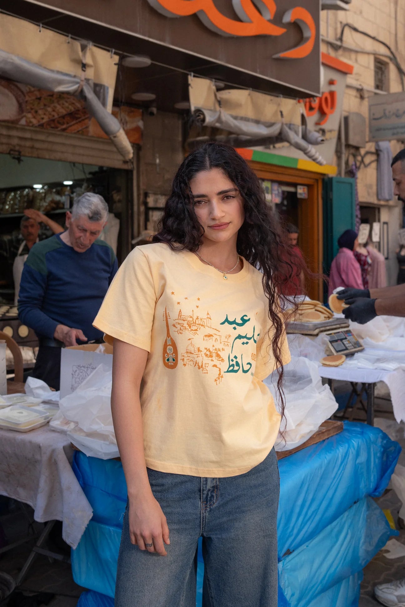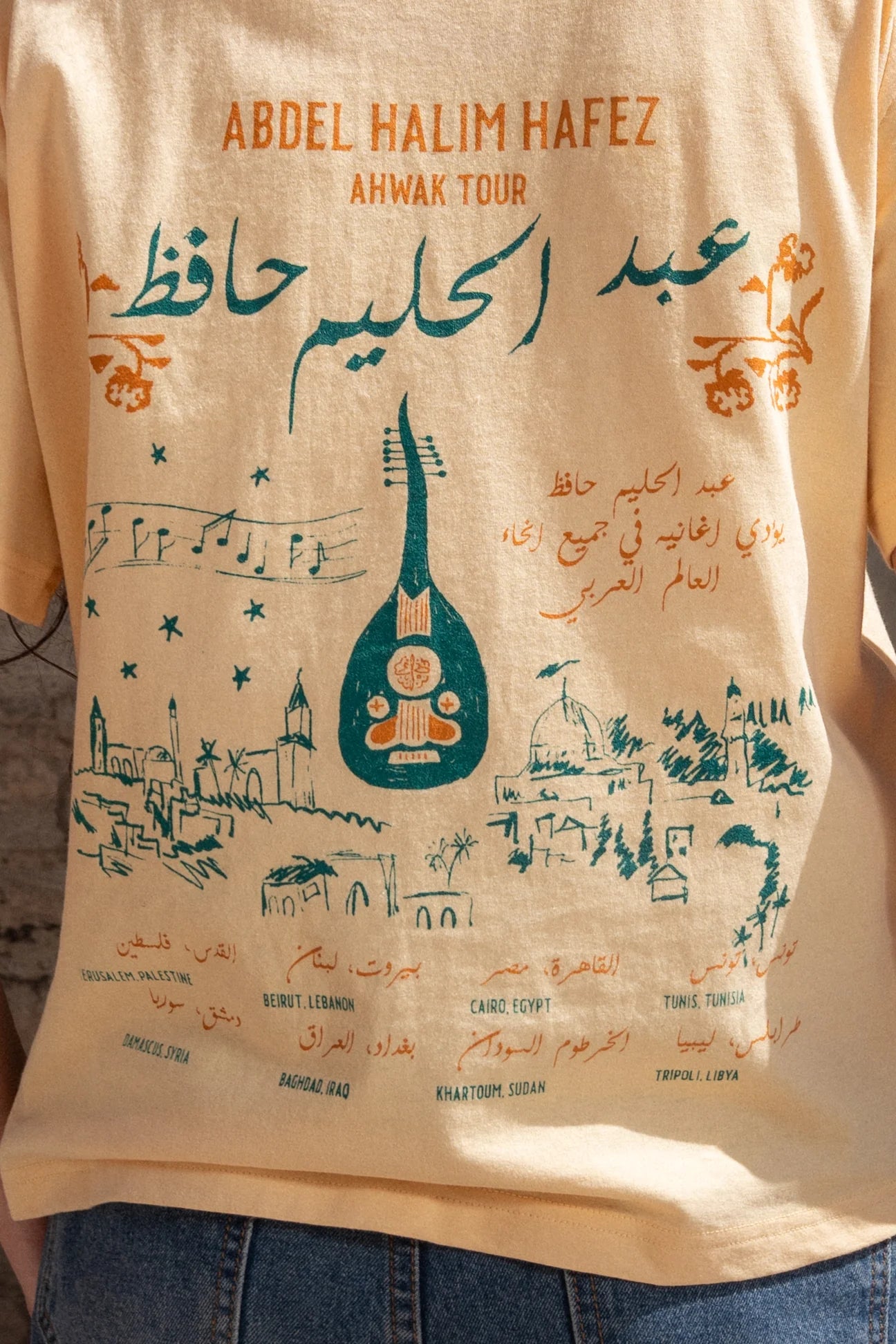 A short-sleeved T-shirt with a round neckline and a relaxed fit, featuring a screen-printed design inspired by a fictional tour of the legendary Egyptian musician and film star, Abdel Halim Hafez, with stops across the Arab world.
