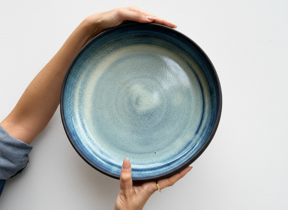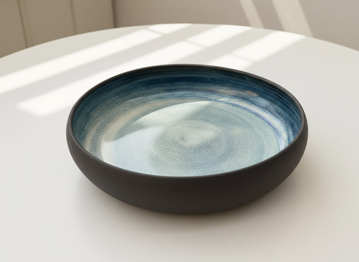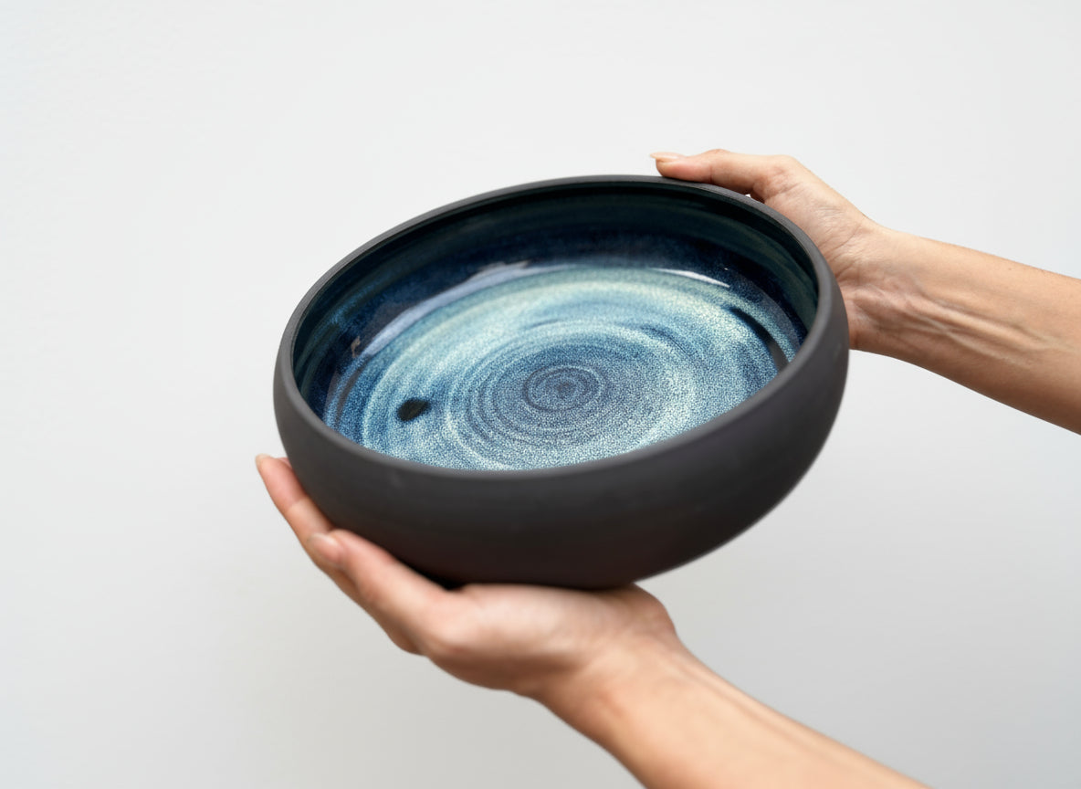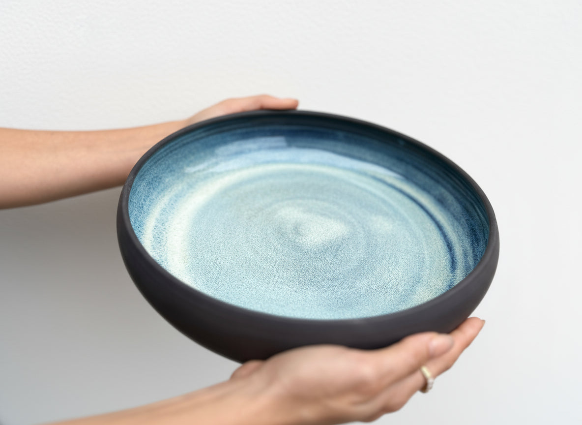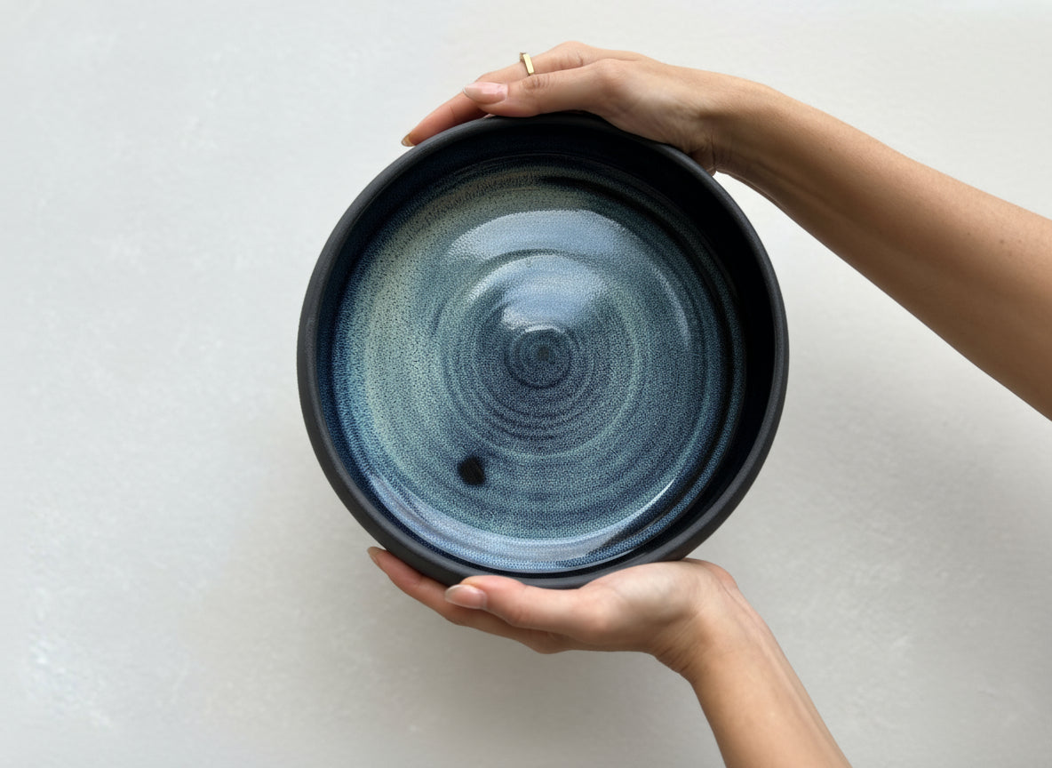 Stoneware black clay ceramic deep dish by 3rd generation Palestinian ceramicist, Nur Minawi. Stunning serving dish for serving salad, fruits or a main dish or simply as a center piece for a modern yet natural touch to any table.