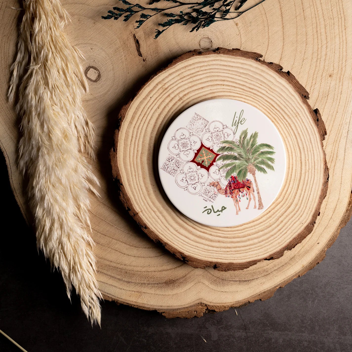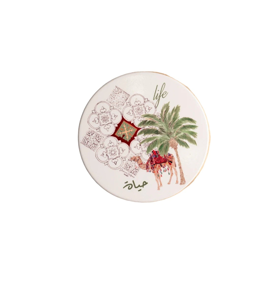 These coasters combine geometric patterns and symbolic natural motifs, including plants, spring flowers, the Palestinian sunbird, and seasonal regional fruits. These designs not only celebrate the natural beauty of the region but also preserve a deep connection to its cultural heritage.