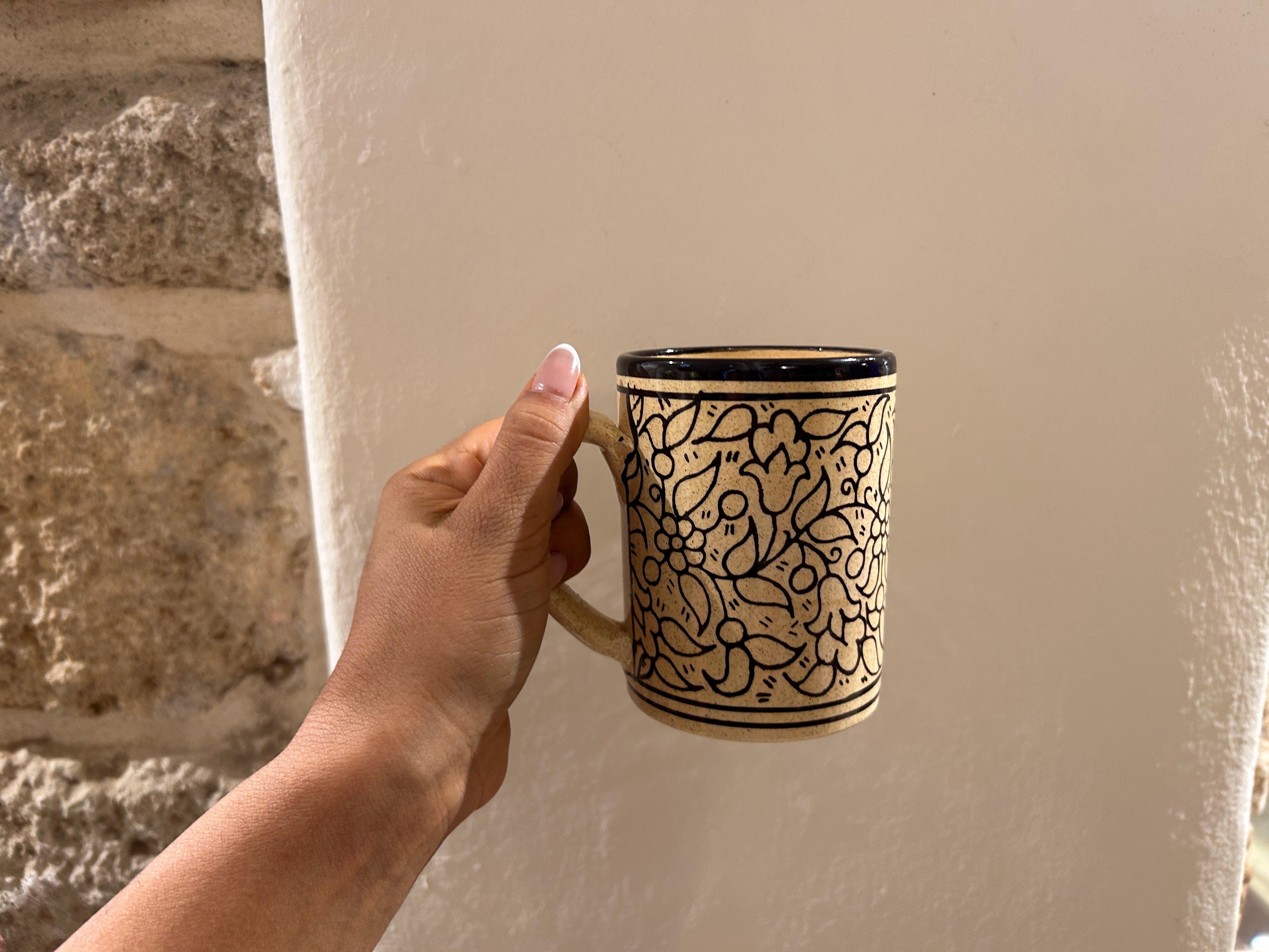 Offering a timeless ode to Palestinian ceramics, these unique earth toned ceramic mugs are handmade in one of the oldest family-run ceramic workshops in Hebron. Glazed with a lightly speckled glaze, over a beige-toned clay, seamlessly marry timeless tradition with modern aesthetics.