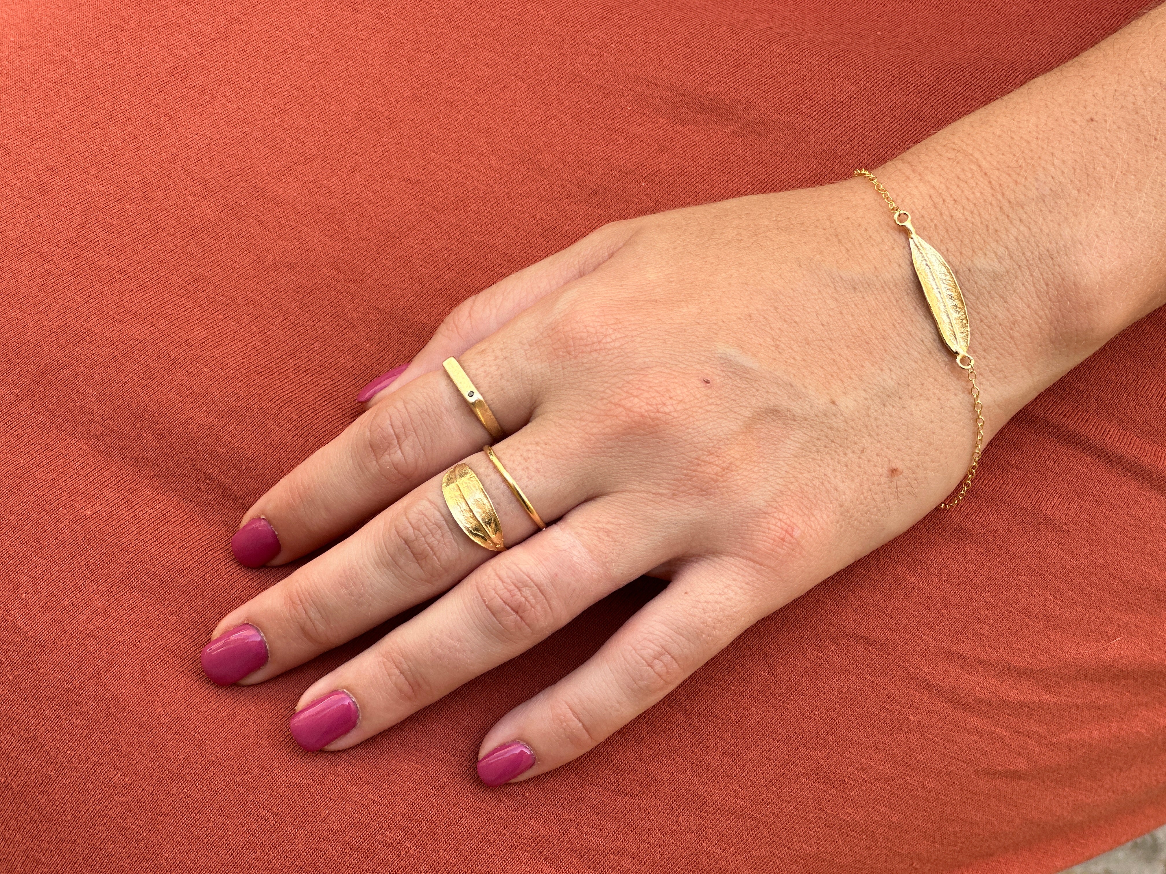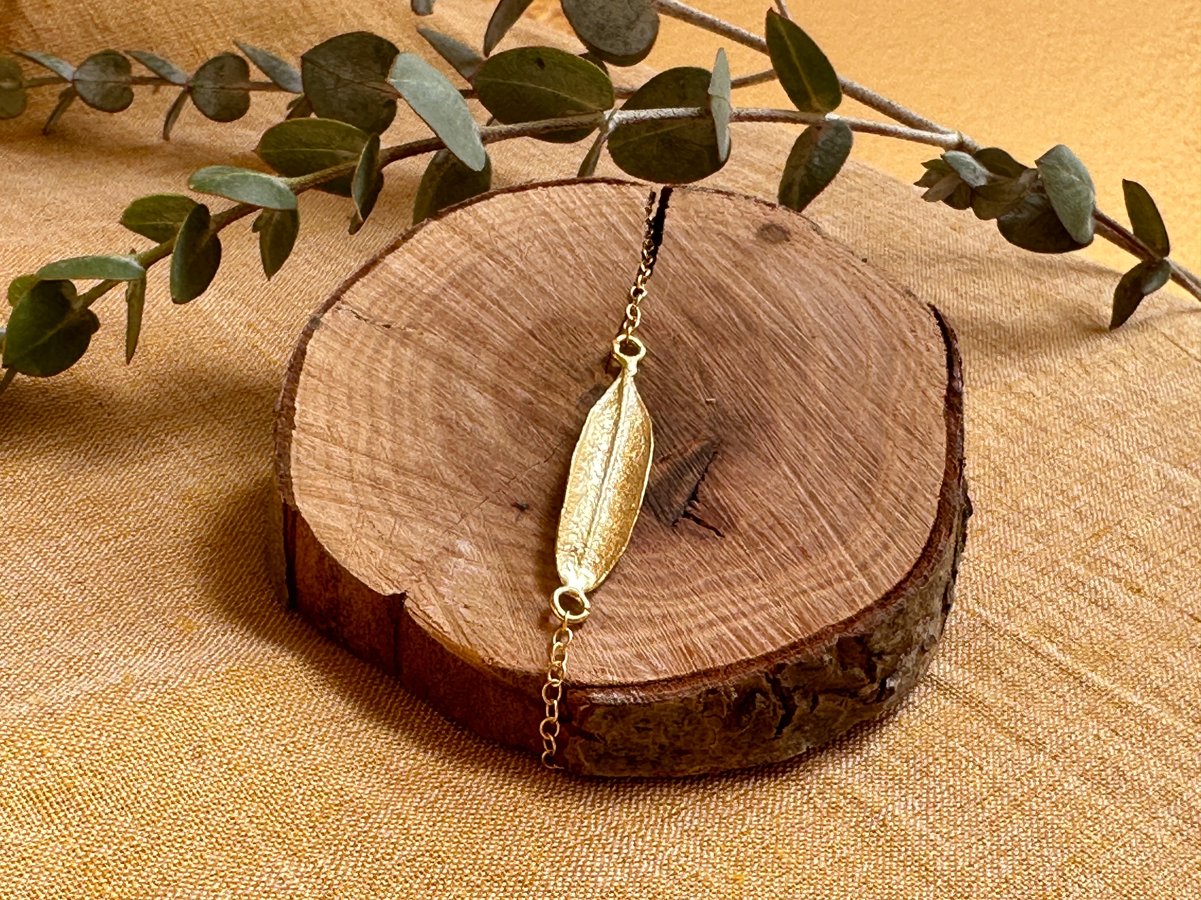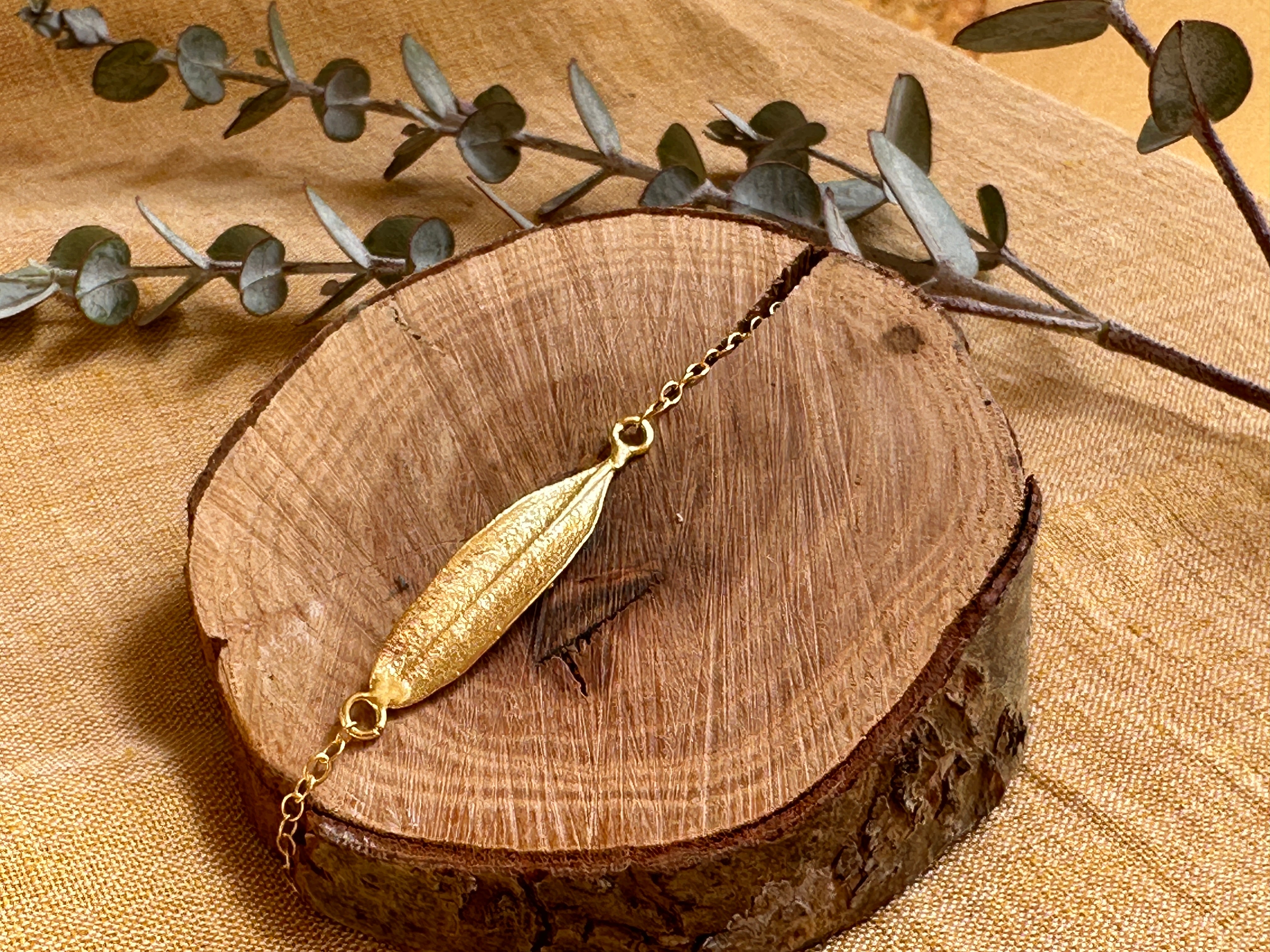 One of a kind gold olive leaf bracelet handmade in Bethlehem. Each gold olive leaf piece is unique, with no two alike. The leaves are handpicked and delicately attached to a wax column, then coated in gypsum to create a detailed mold. This process ensures that every piece is one of a kind.