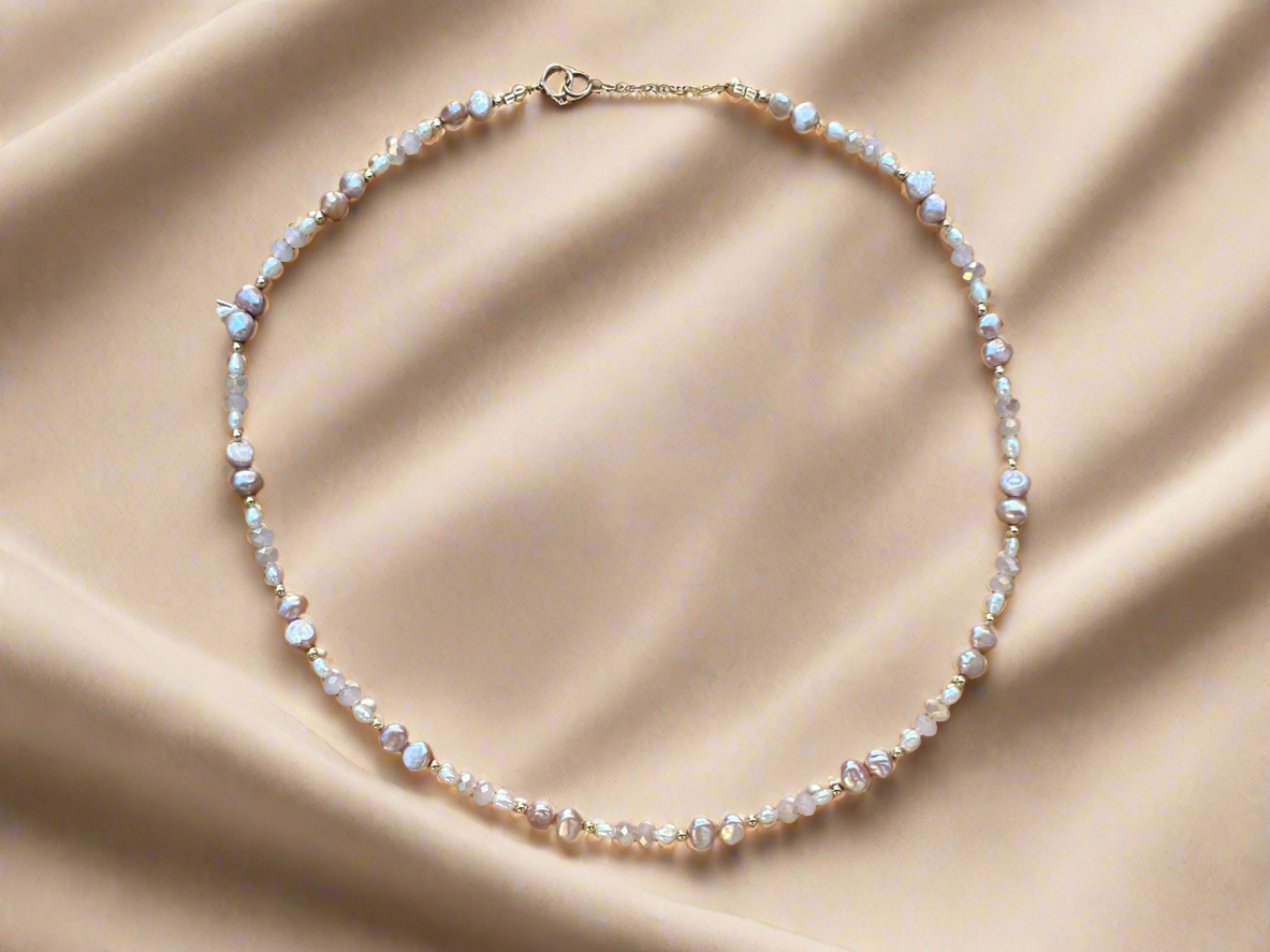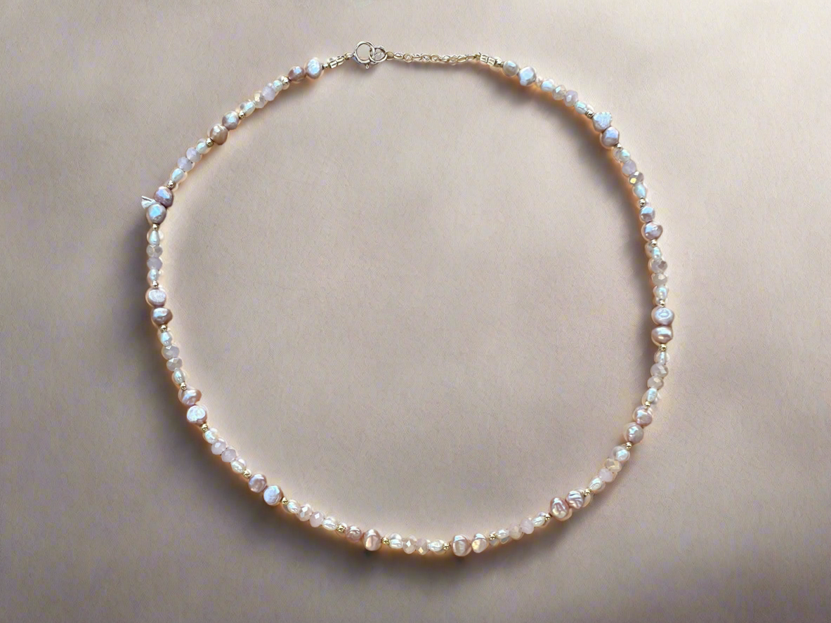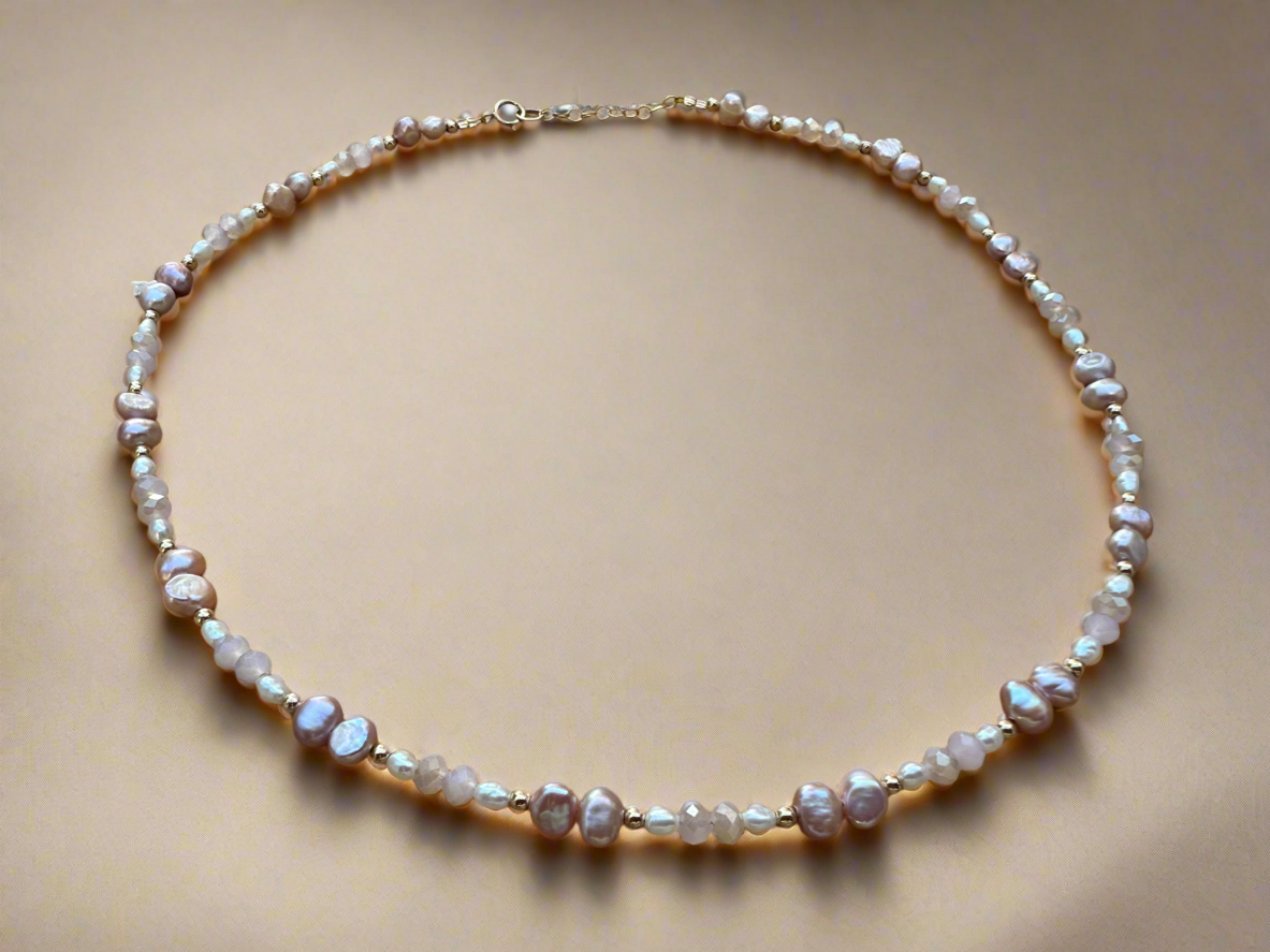 This pearl necklace is named: Inas, which is the name of a pure and kind hearted girl. Hey name means to feel at peace. This is a handmade necklace made of natural freshwater pearls, crystal beads and 14k gold filled