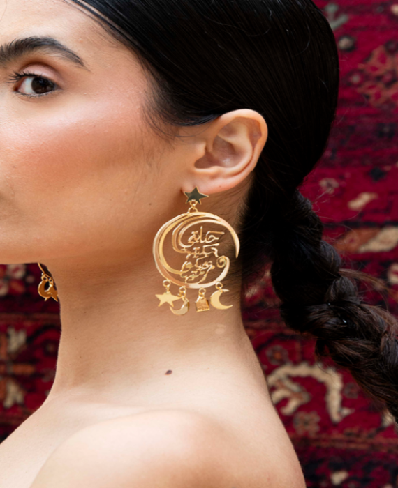 This striking statement earring honors the power of stories passed down through the centuries by being inscribed in Kufic Arabic calligraphy.