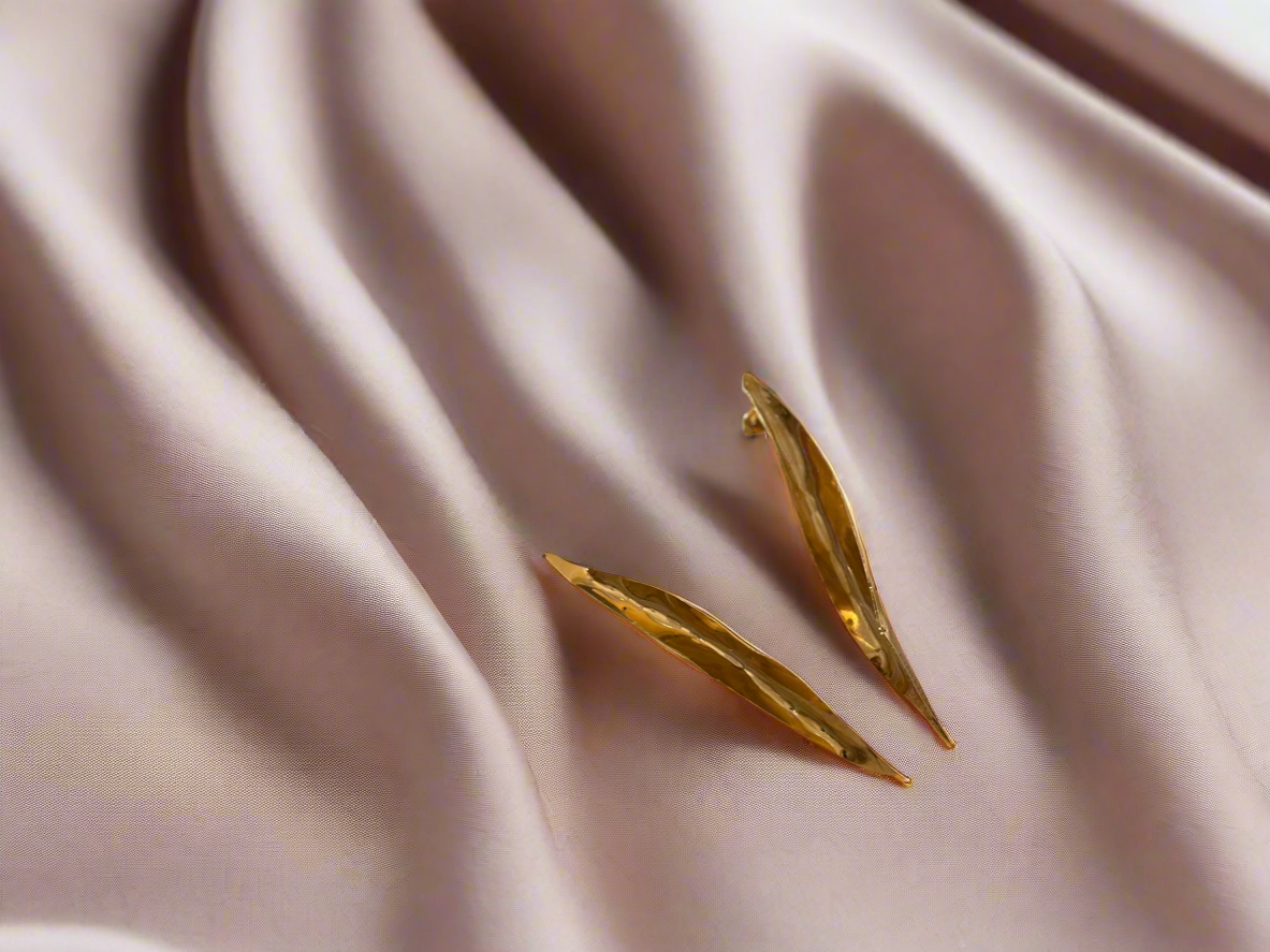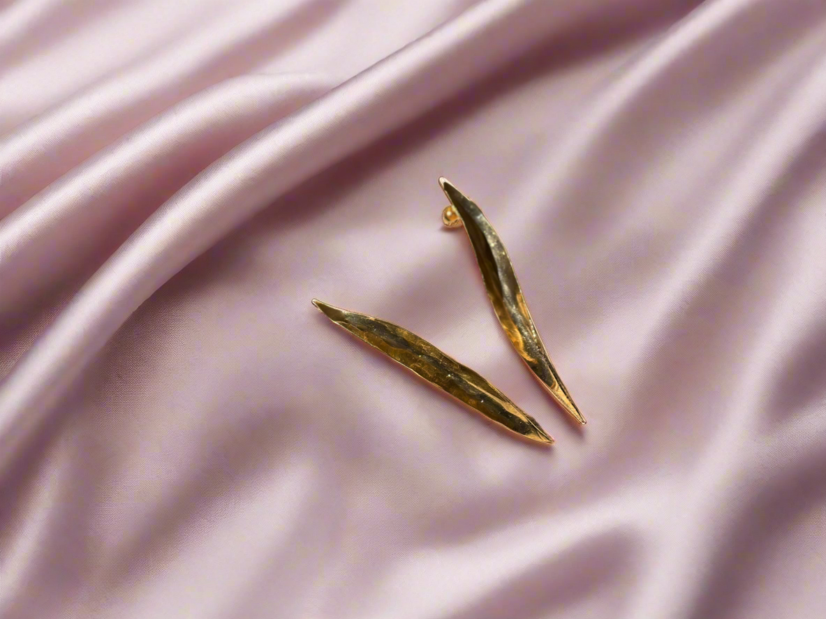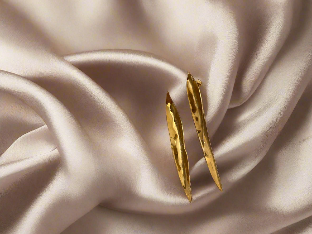 Inspired by nature, these Olive Leaf Earrings by Mai Zarkawi are hand-cut from brass sheets and hand-folded naturally, allowing the metal to shape itself organically. Finished with a luxurious 14k gold plating, they showcase intricate craftsmanship and timeless elegance. Created by Mai Zarkawi, these earrings embody the beauty of nature and the artistry behind each piece, making them a unique statement for any occasion.