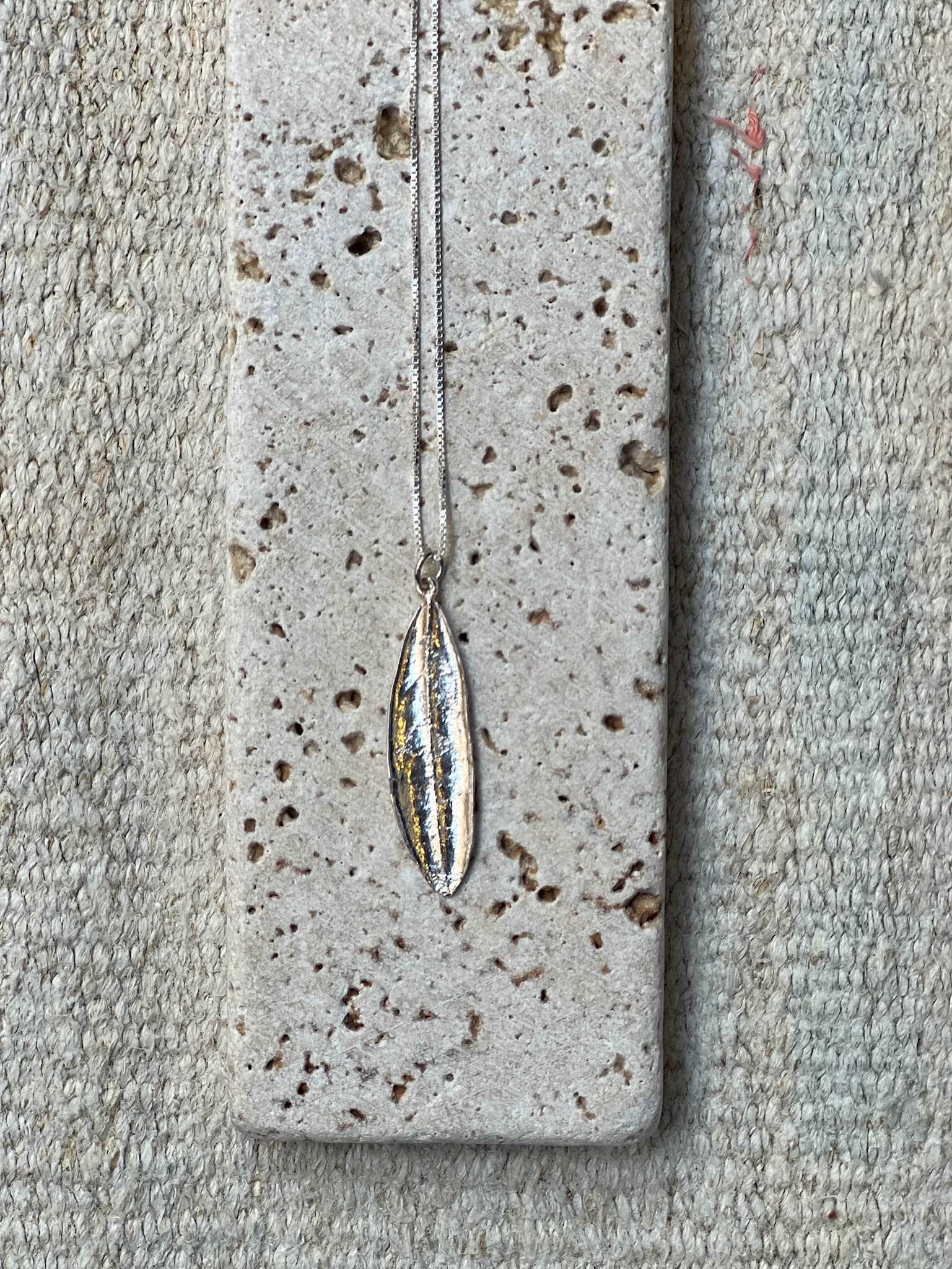 Handmade silver olive leaf pendant, exquisitely crafted from delicate leaves by the esteemed Palestinian jewelry designer Nadia Abu Ghattas. A native of Beit Jala, Bethlehem, her pieces draw inspiration from the iconic Palestinian olive tree, which for Nadia represents steadfastness and resilience.