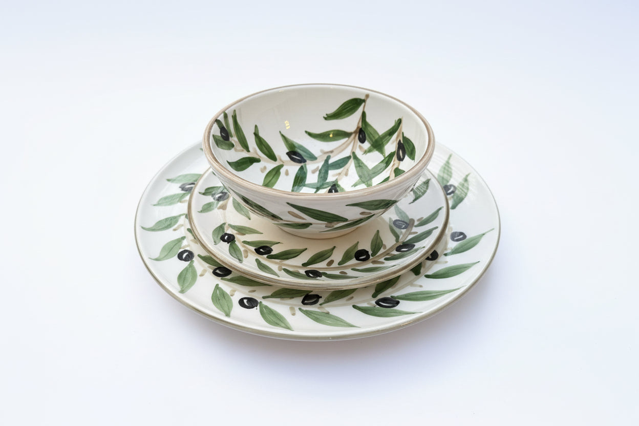 Create a beautiful and meaningful dinner table with this custom-made olive leaf ceramic dinner set, thoughtfully crafted by a women-run ceramic studio in Nisf Jbeil, a small village of 300 residents located north of the Palestinian city of Nablus.