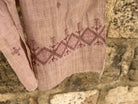 This lightweight summer scarf offers sophisticated elegance, featuring exquisite hand embroidery at both ends crafted by the renowned Idna Ladies' Association of Hebron, Palestine - the perfect finishing touch to any ensemble.