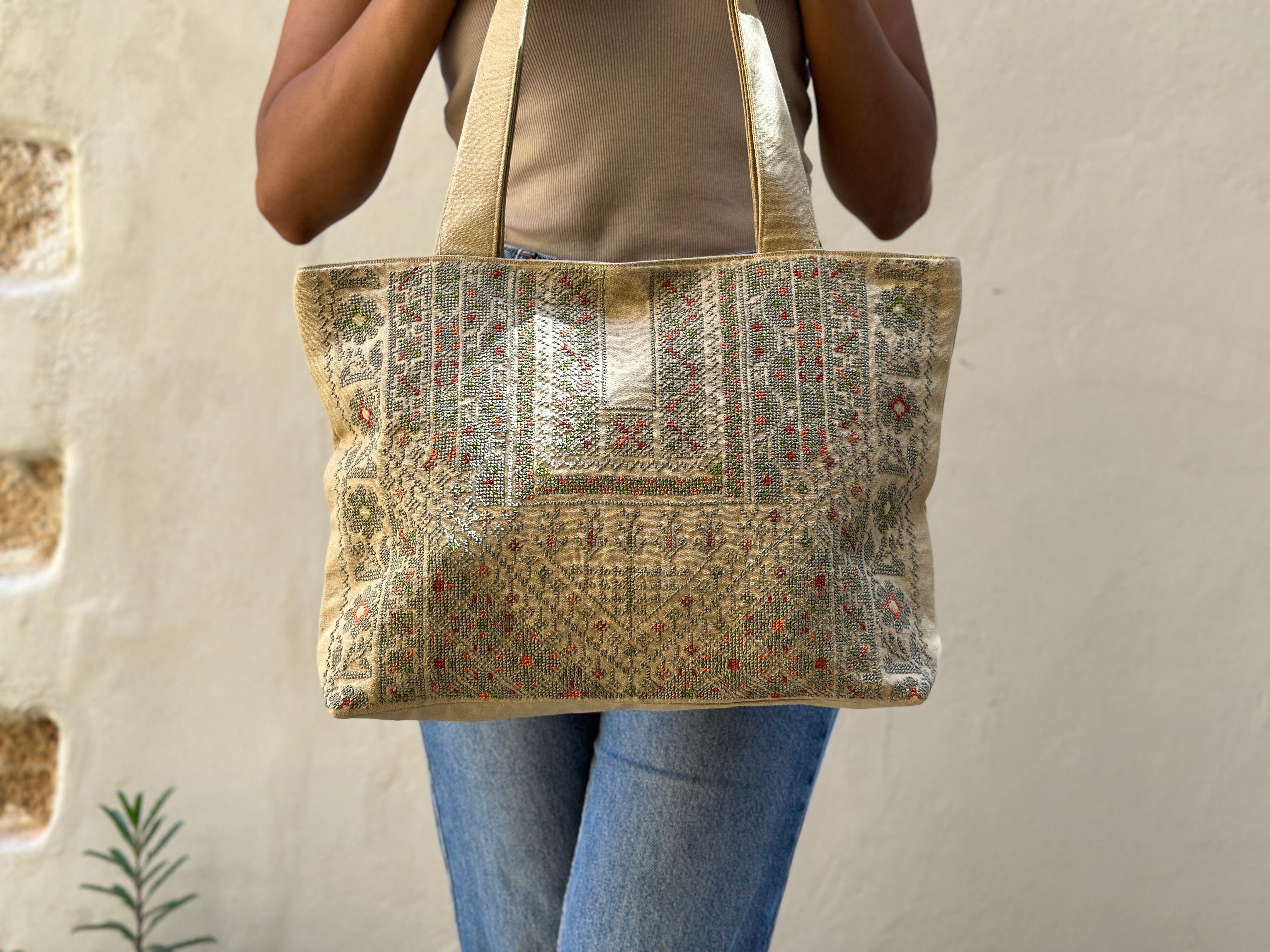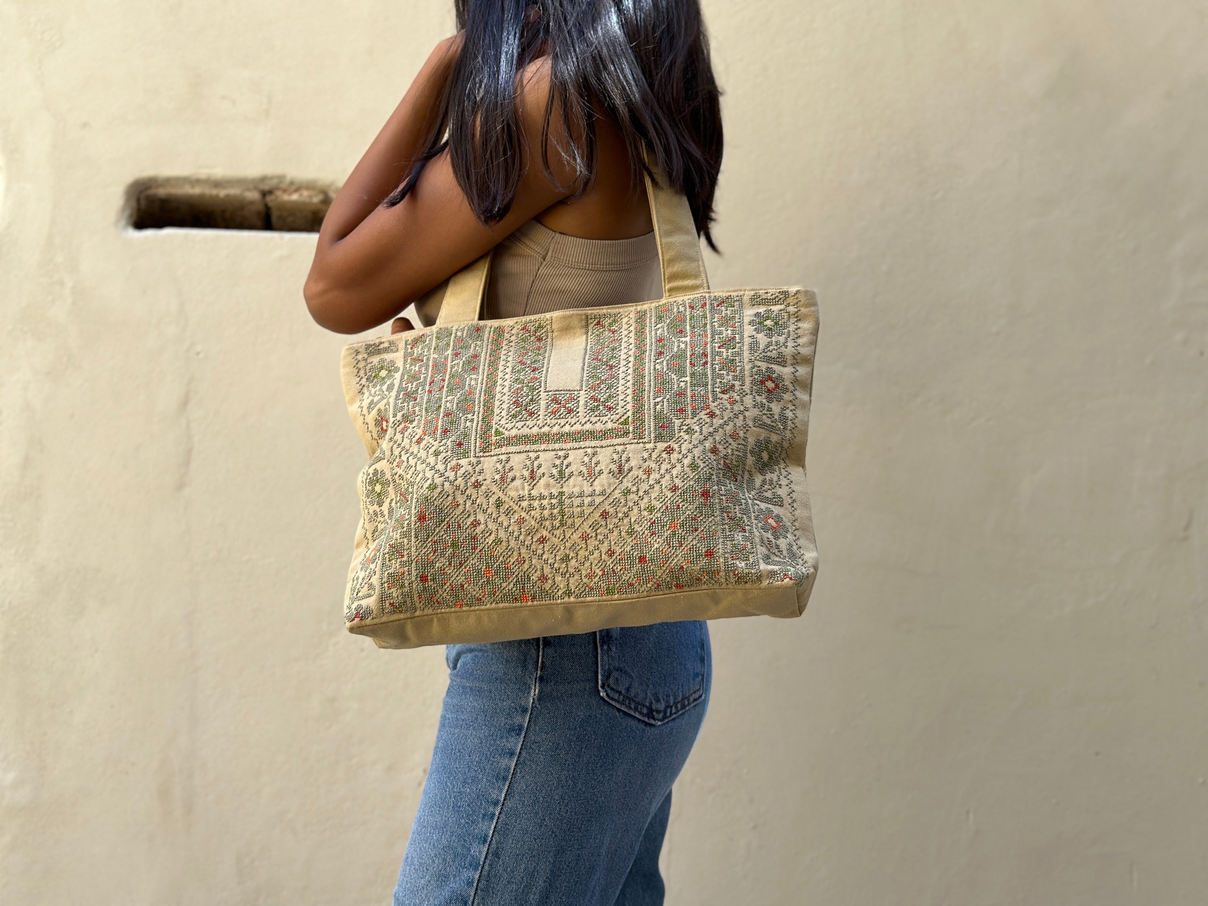 A stunningly hand embroidered handbag, perfect for everyday use with an interior pocket and a zipper enclosure. Skillfully crafted by the Idna Ladies' Association, an embroidery initiative founded in 1998 by a collective of female artisans in Idna, a rural village in Hebron.