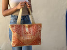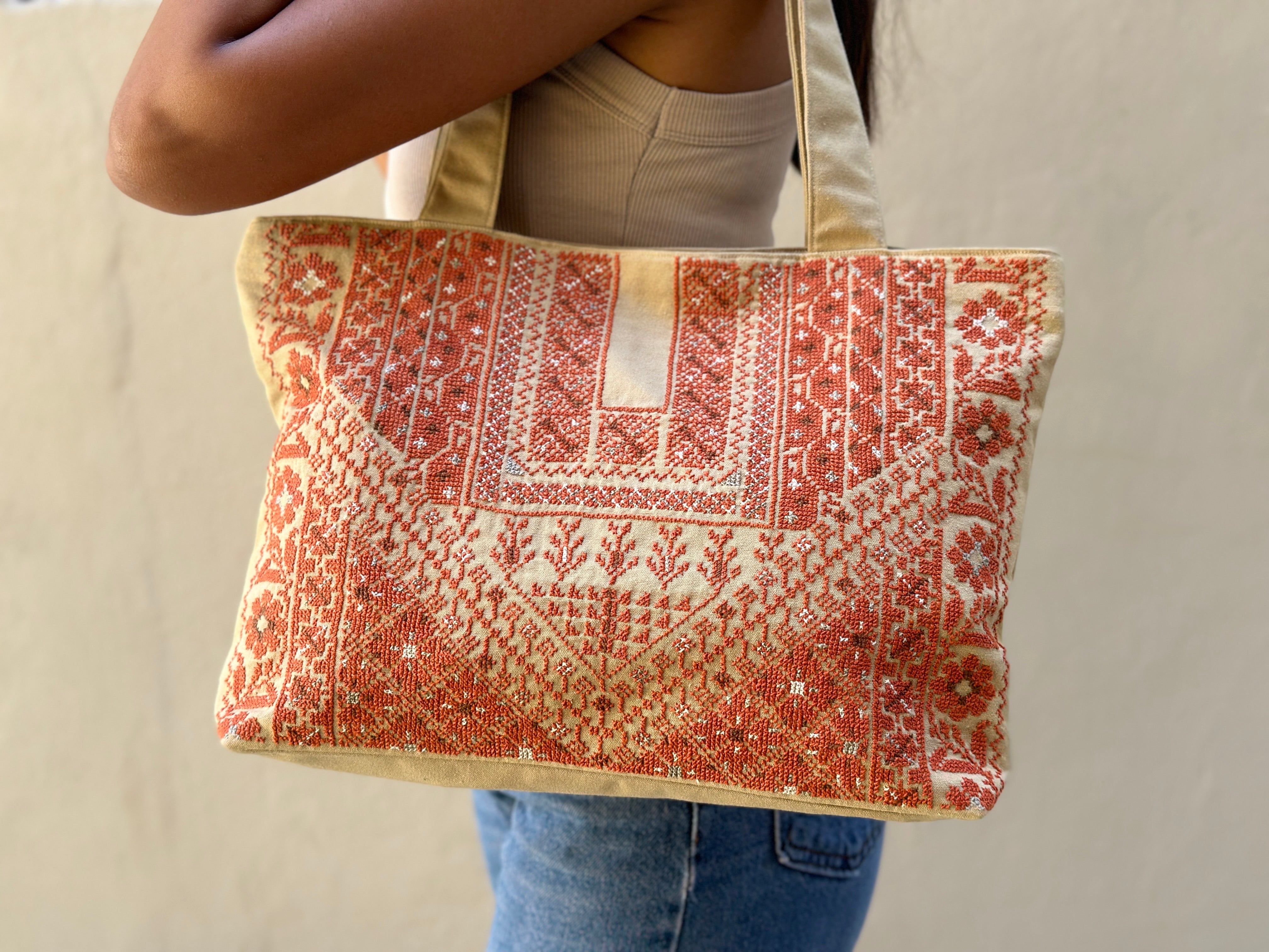 A stunningly hand embroidered handbag, perfect for everyday use with an interior pocket and a zipper enclosure. Skillfully crafted by the Idna Ladies' Association, an embroidery initiative founded in 1998 by a collective of female artisans in Idna, a rural village in Hebron.