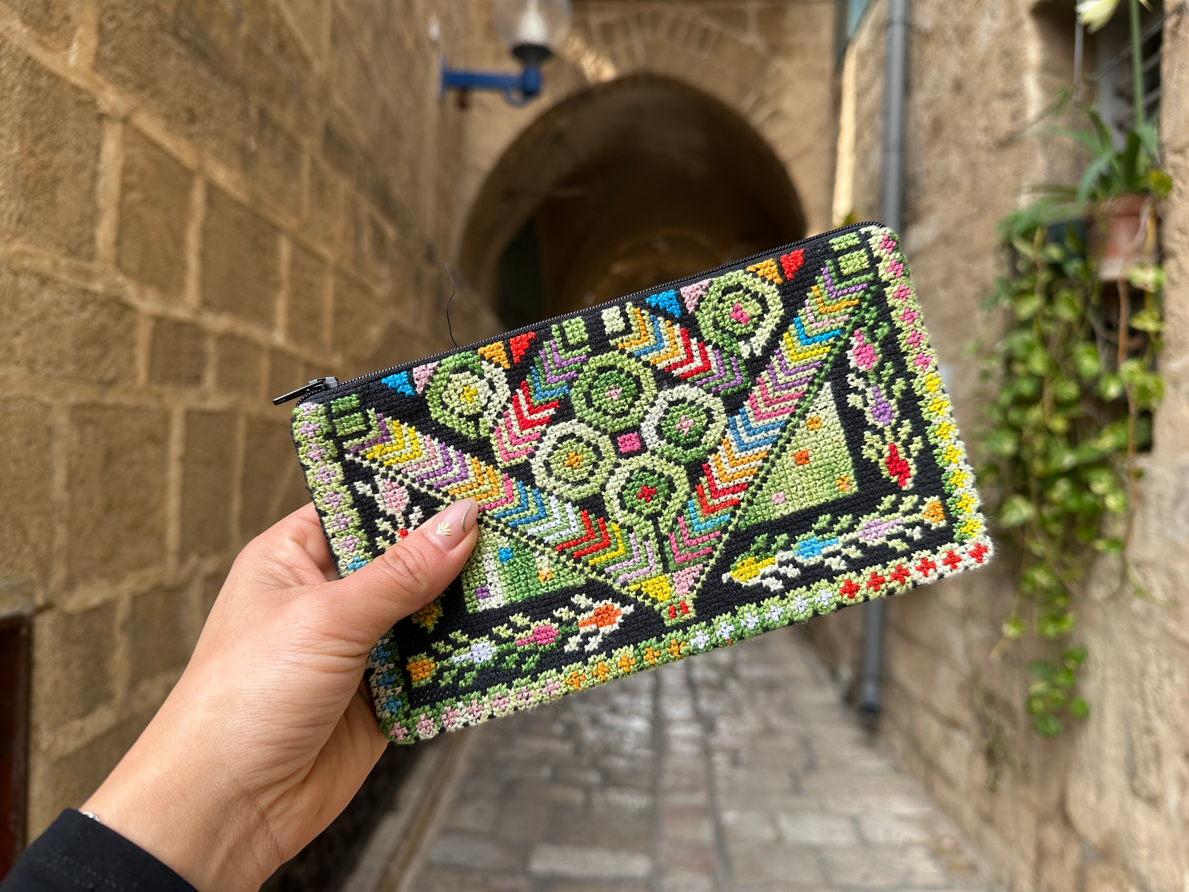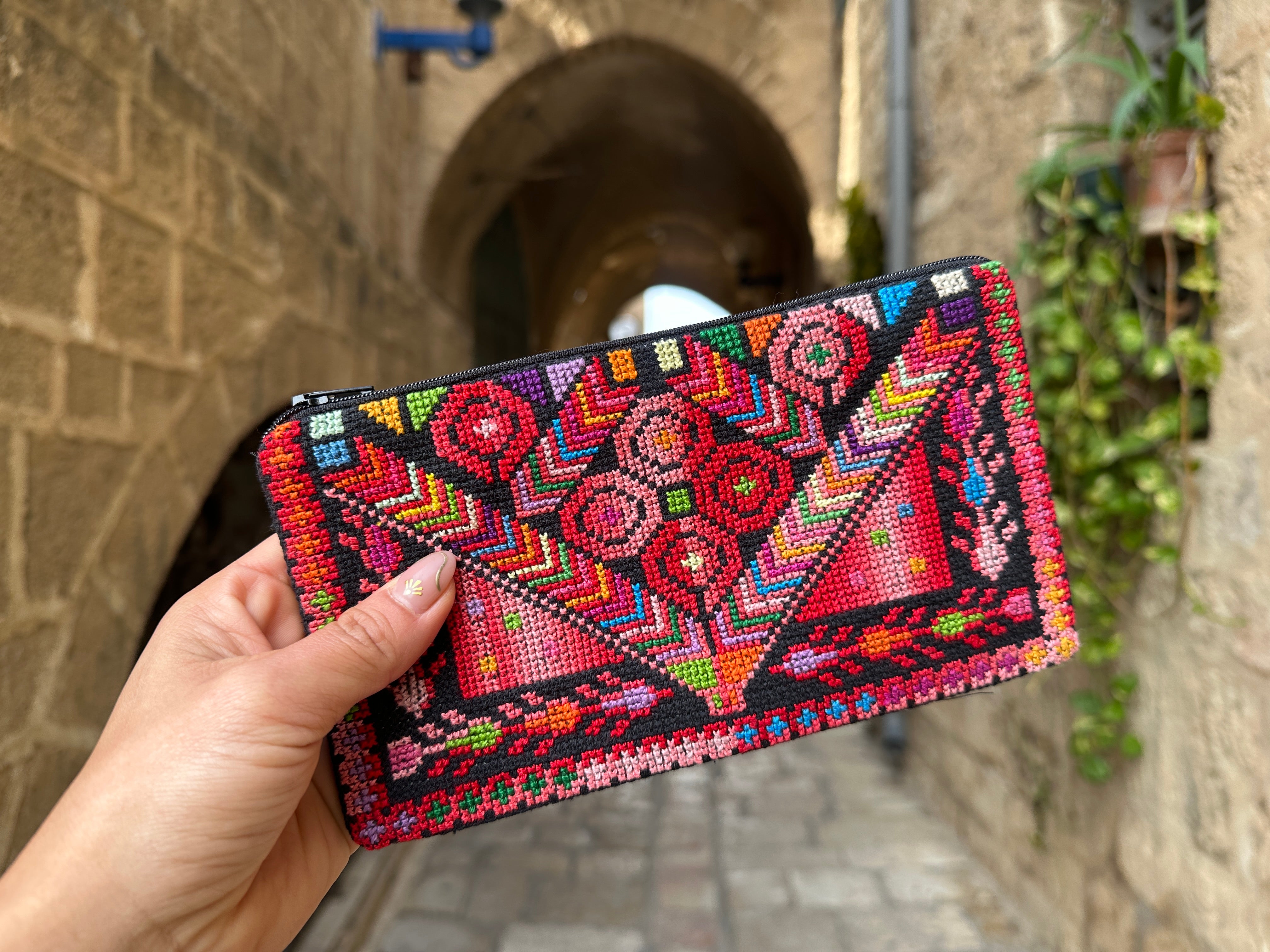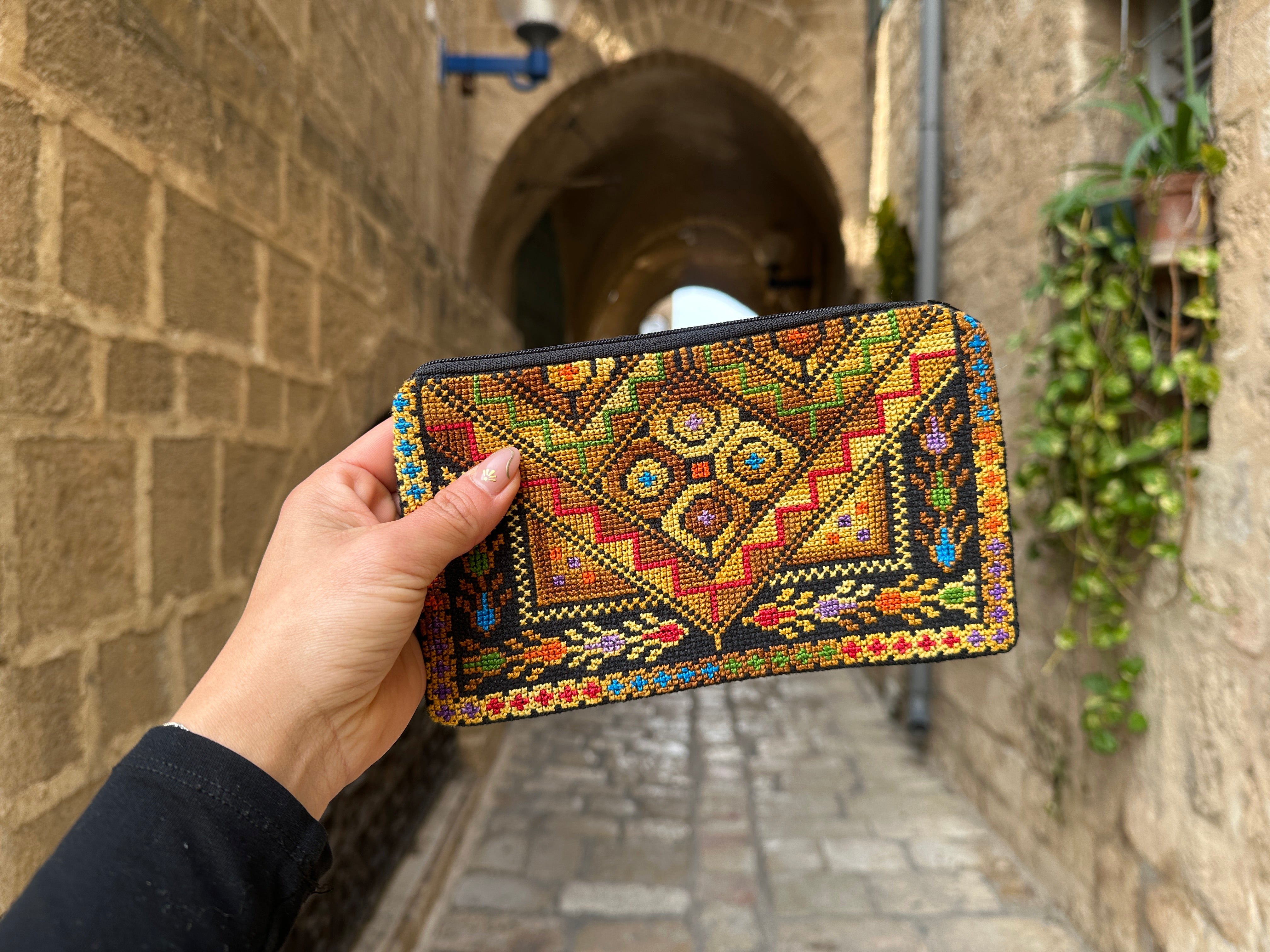 Hand embroidered wallet with a zipper from a local women's cooperative, the Women’s Arab Association in Bethlehem.