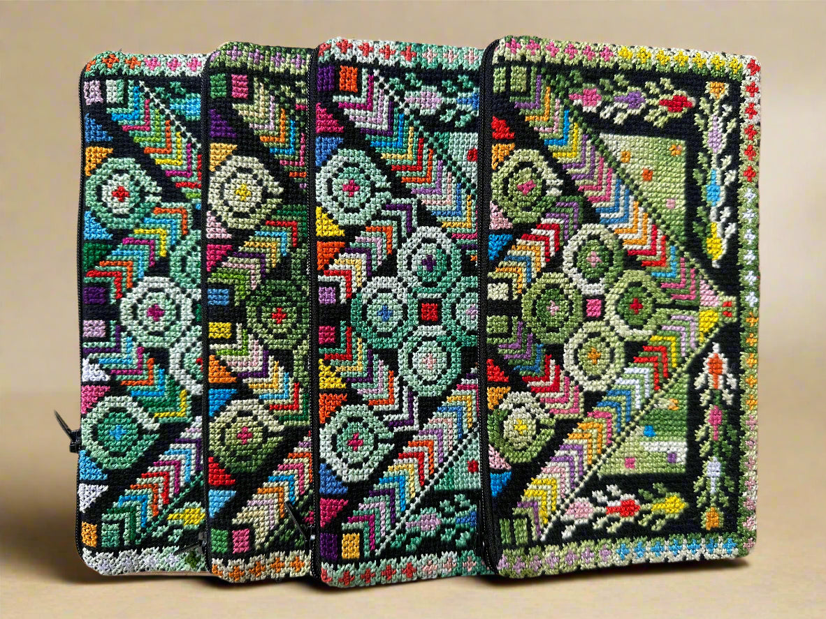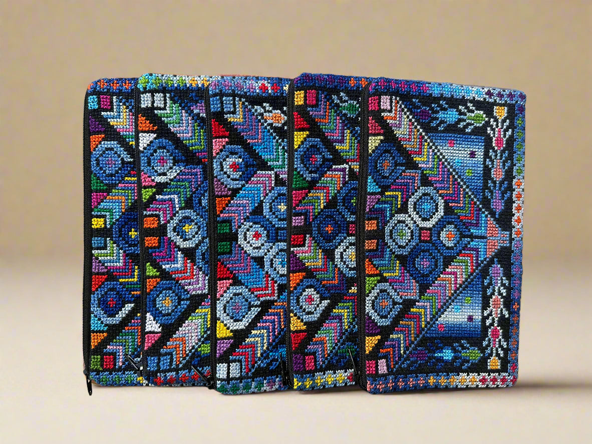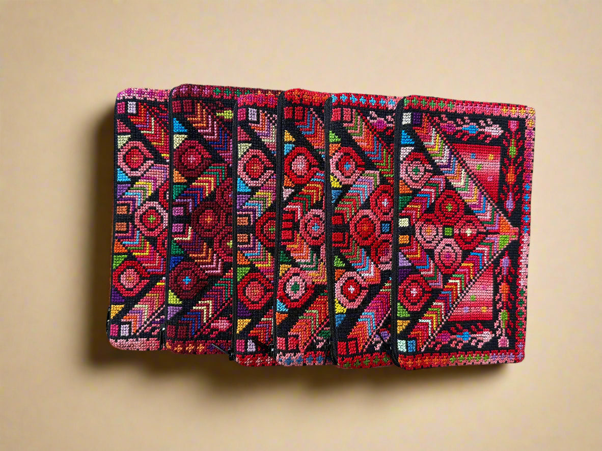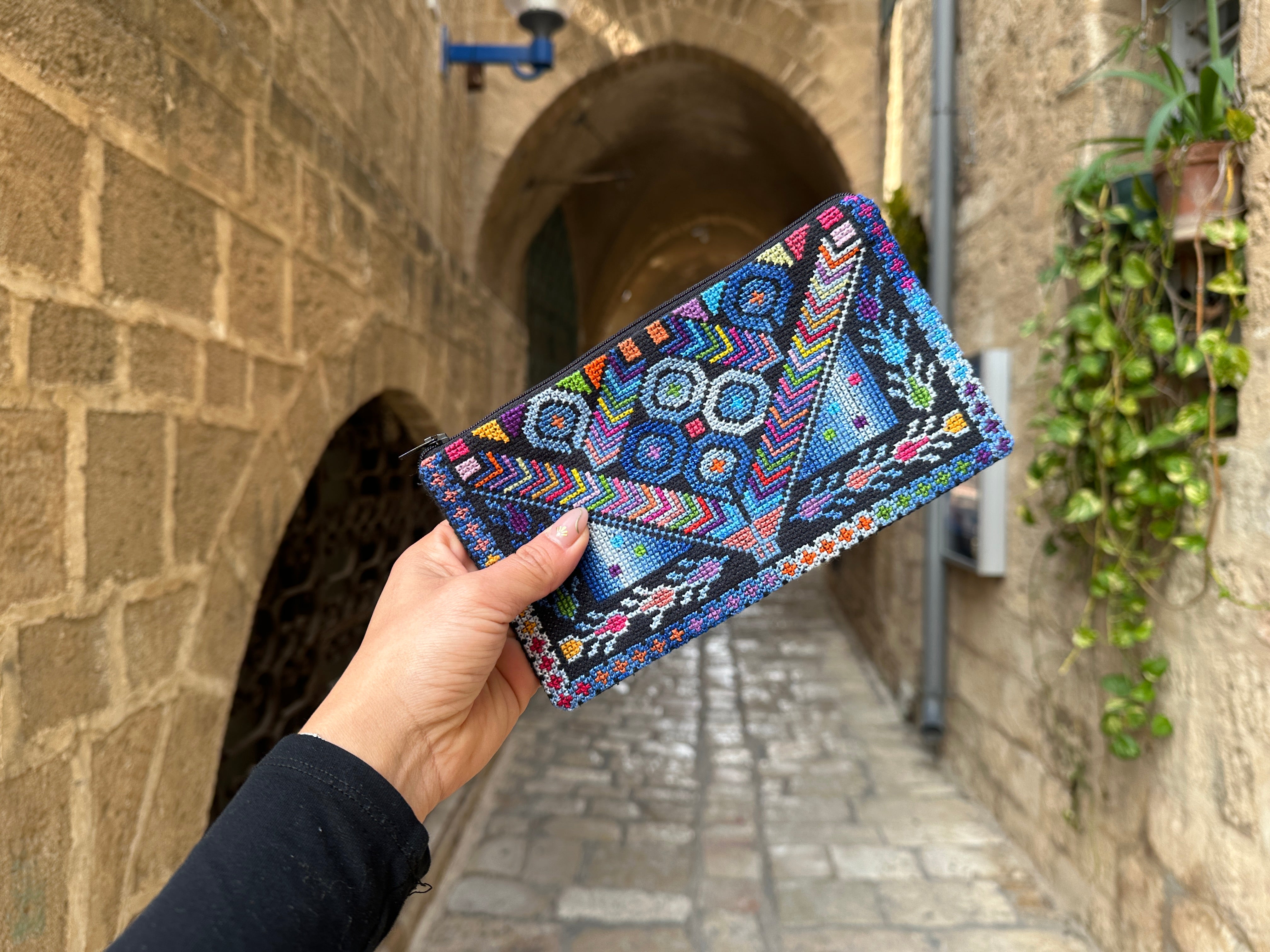 Hand embroidered wallet with a zipper from a local women's cooperative, the Women’s Arab Association in Bethlehem.