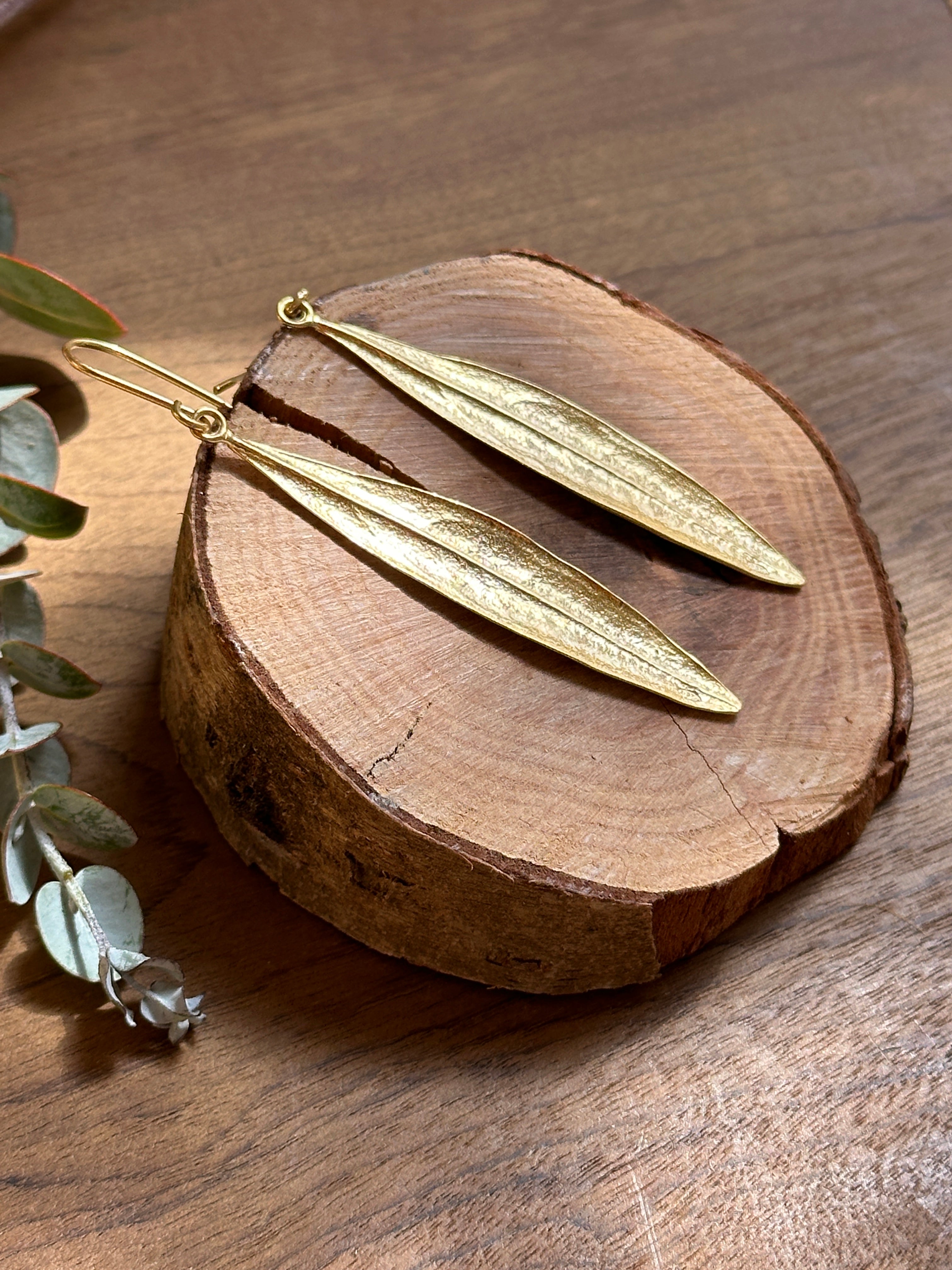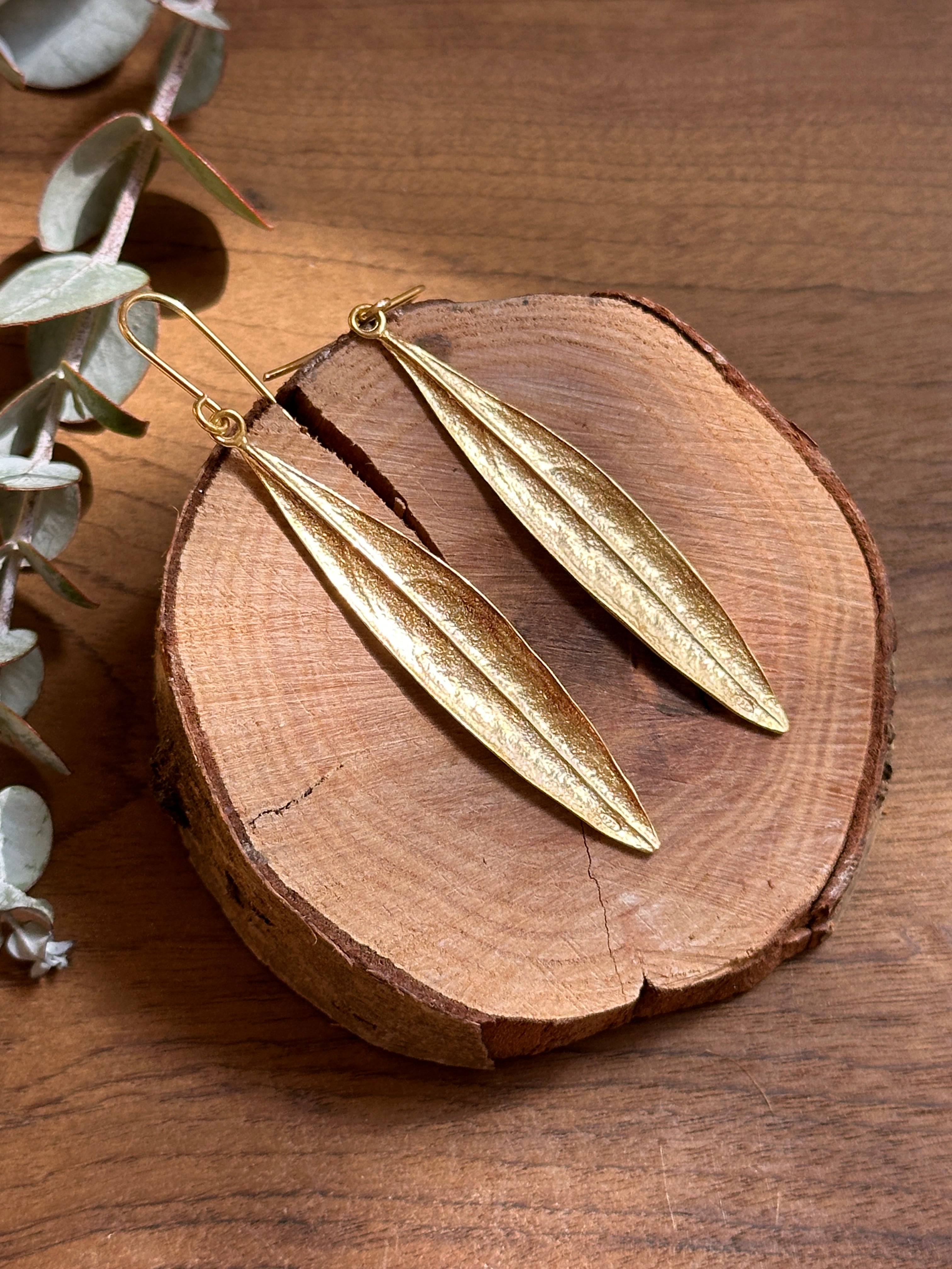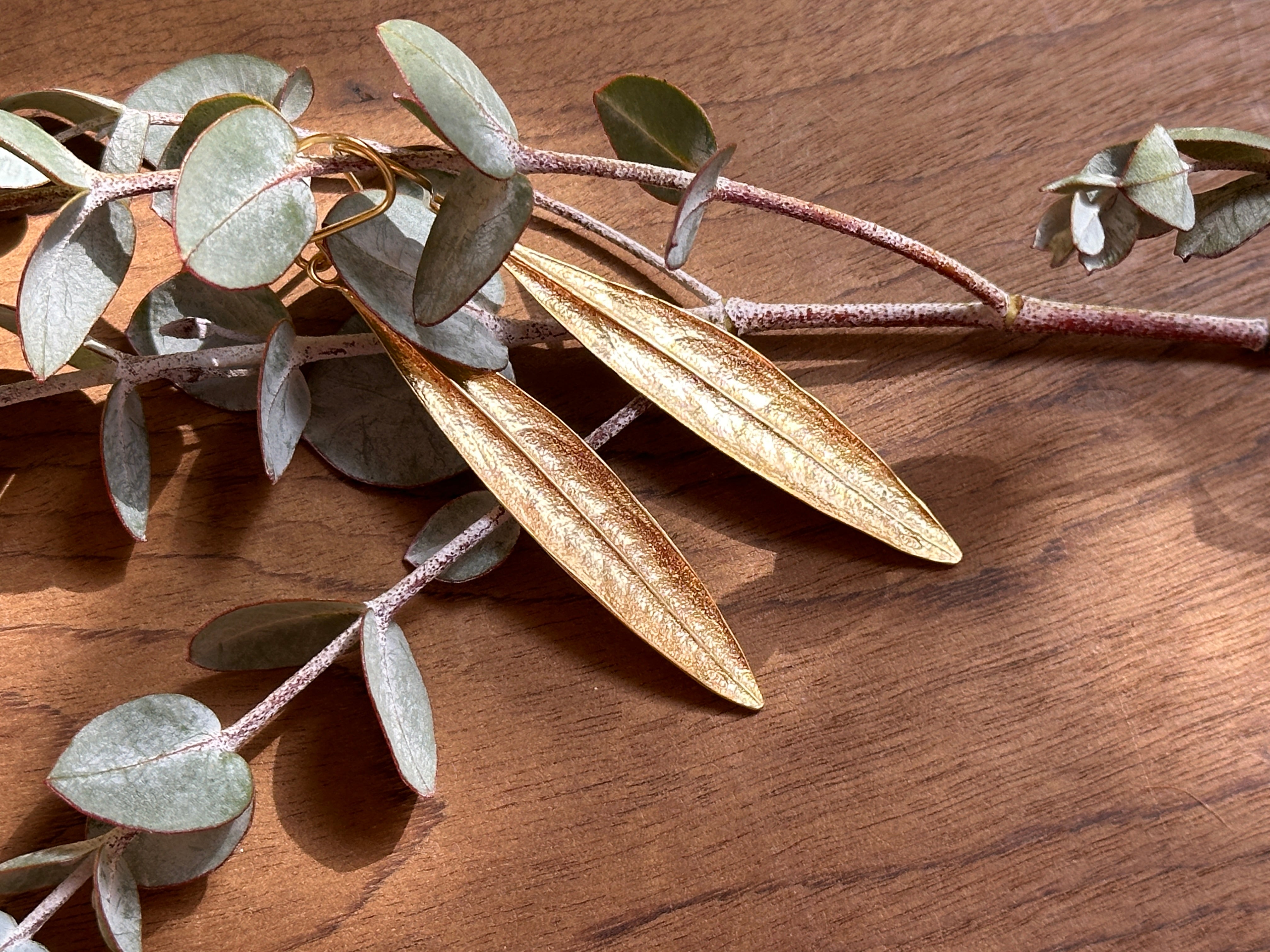One of a kind gold olive leaves earrings from handmade in Bethlehem. Each gold olive leaf piece is unique, with no two alike. Nadia handpicks the leaves from her family garden and uses the leaves to create one of a kind pieces. The earrings are made of 925 Sterling Silver and then gold plated. A classic addition to any wardrobe.