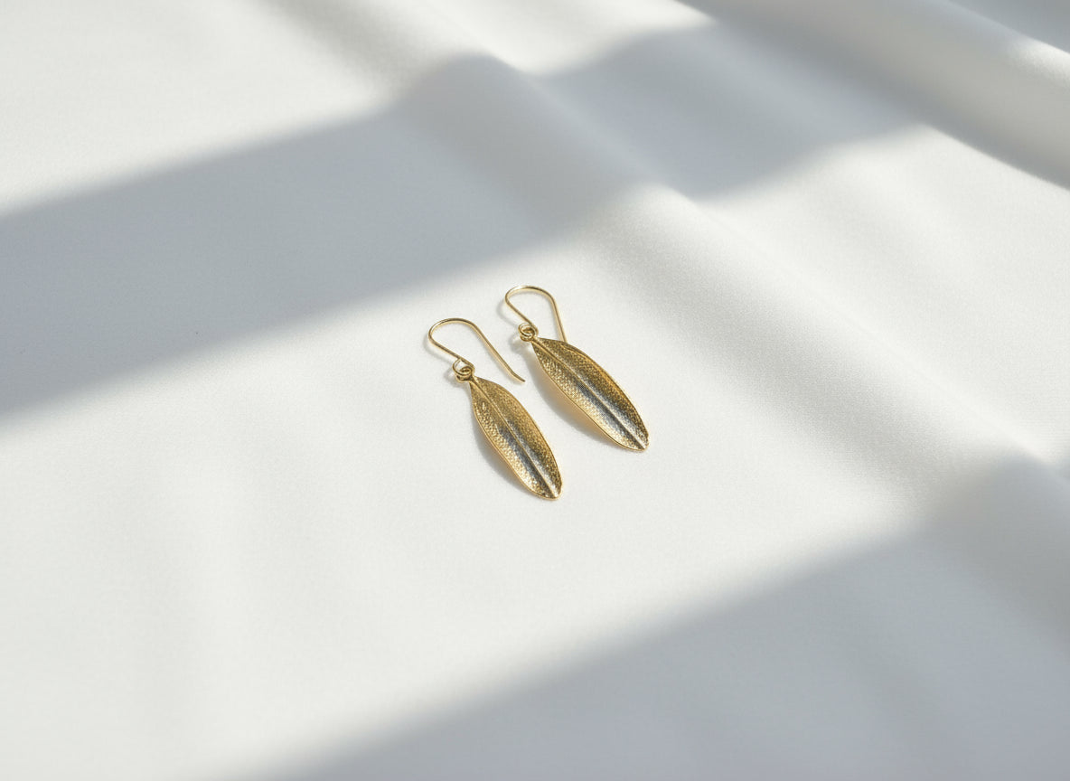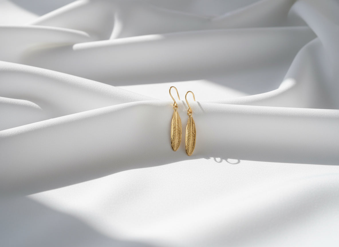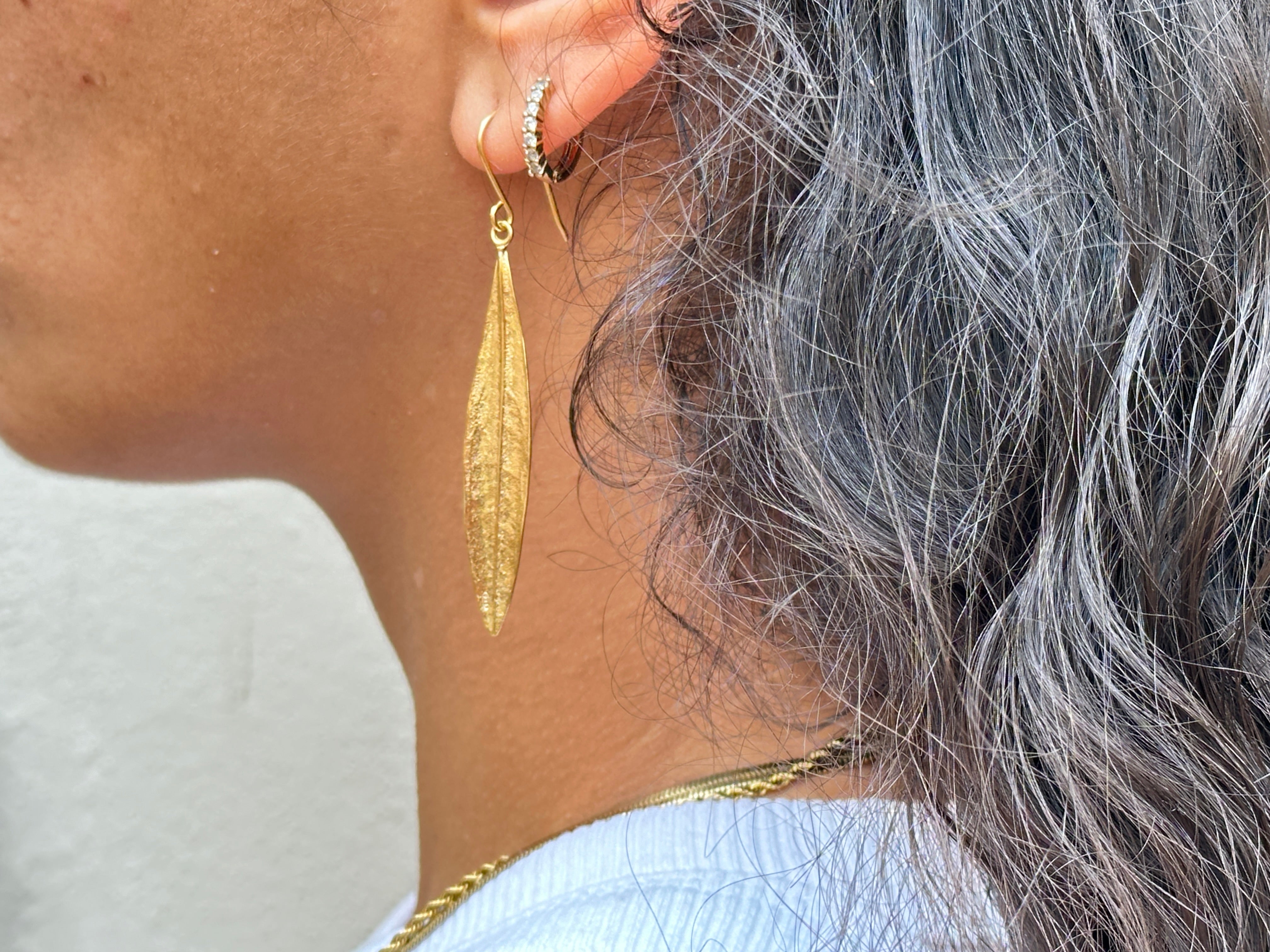 One of a kind gold olive leaves earrings from handmade in Bethlehem. Each gold olive leaf piece is unique, with no two alike. Nadia handpicks the leaves from her family garden and uses the leaves to create one of a kind pieces. The earrings are made of 925 Sterling Silver and then gold plated. A classic addition to any wardrobe.