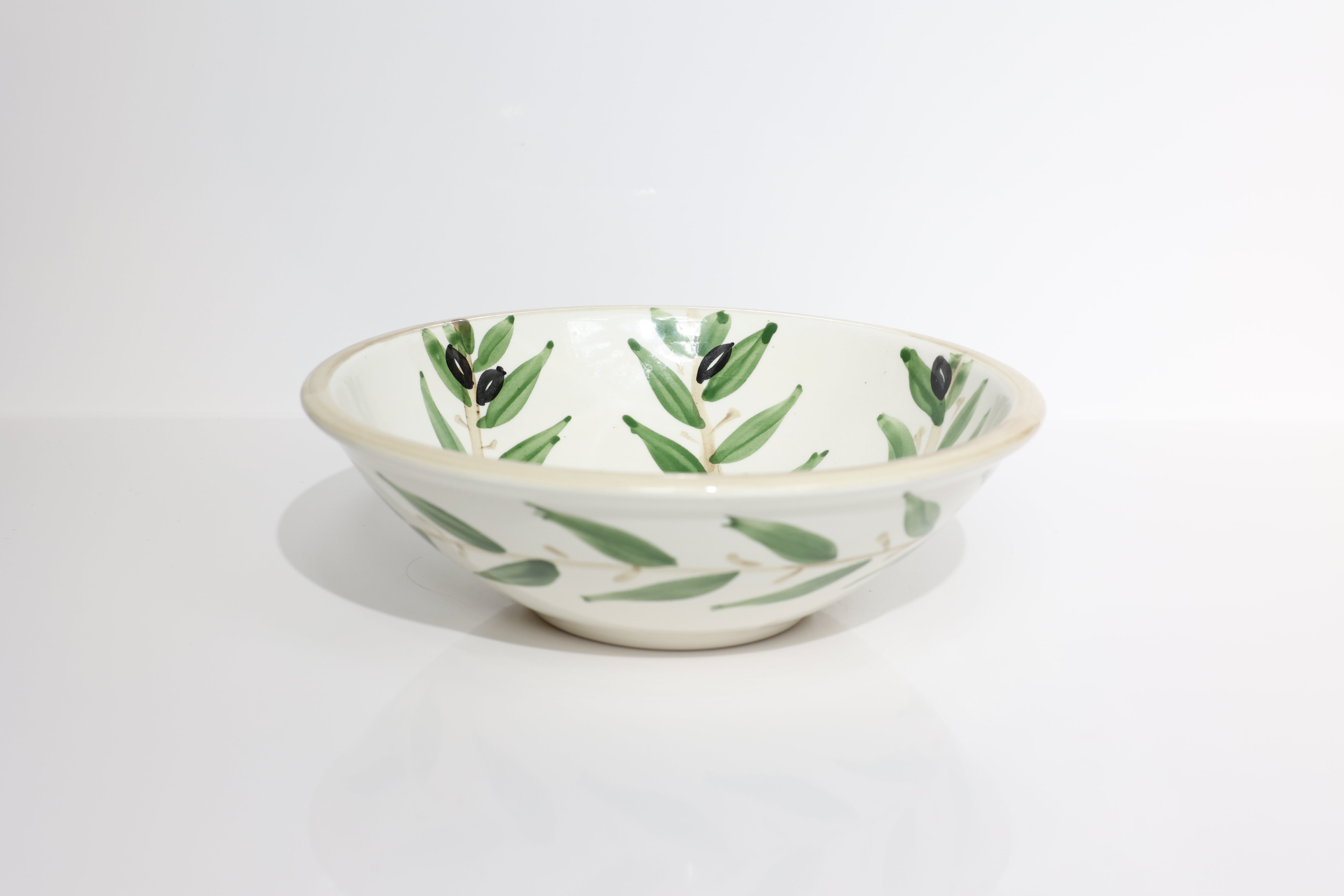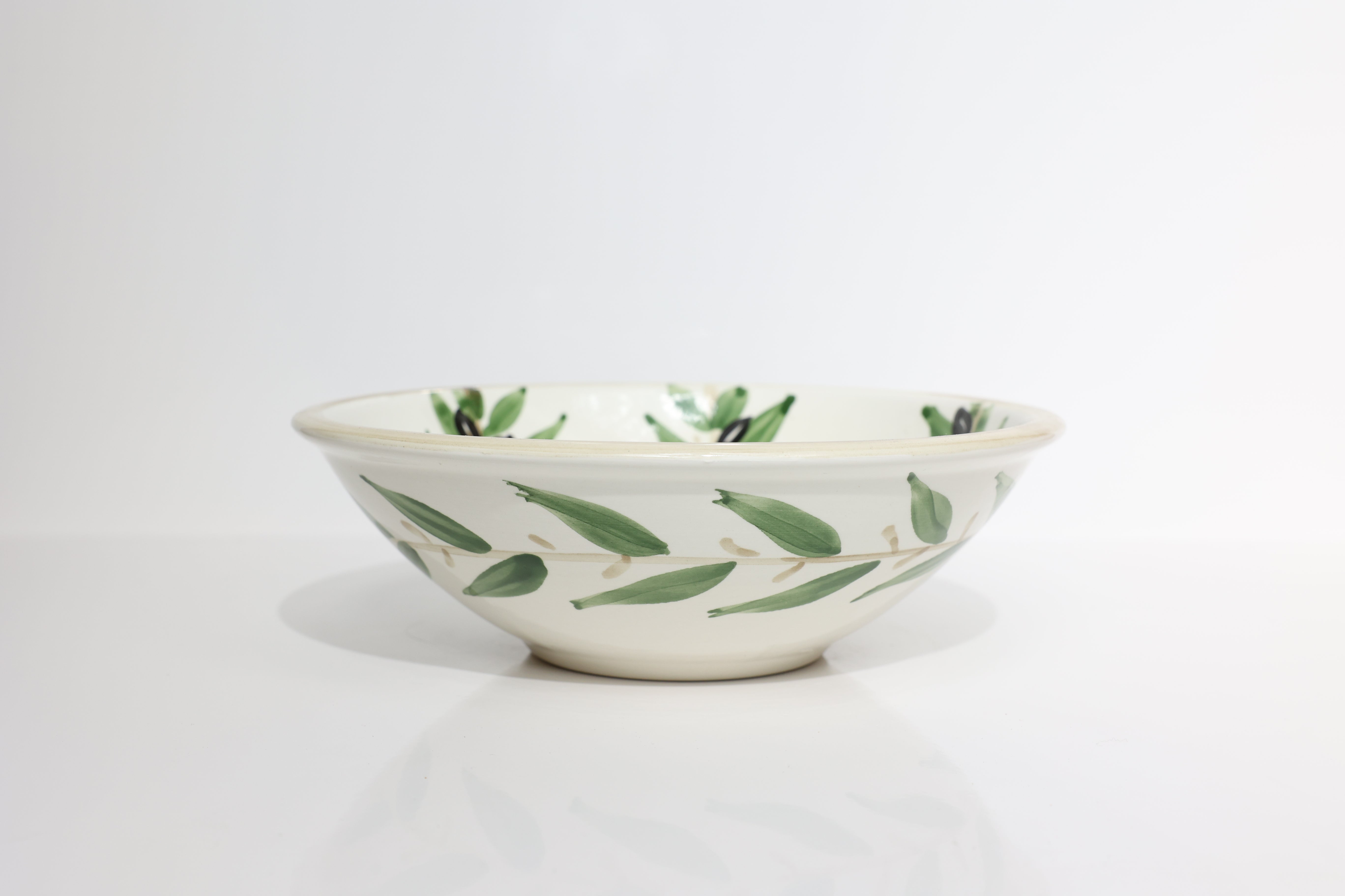 Ceramic hand-painted olive leaf bowls perfect for a salad or some fruits. Mediterranean styles simple and elegant hand-painted ceramic salad or fruit bowl - made in a women-run ceramic studio in Nisf Jbeil, a small village of 300 residents located north of the Palestinian city of Nablus.