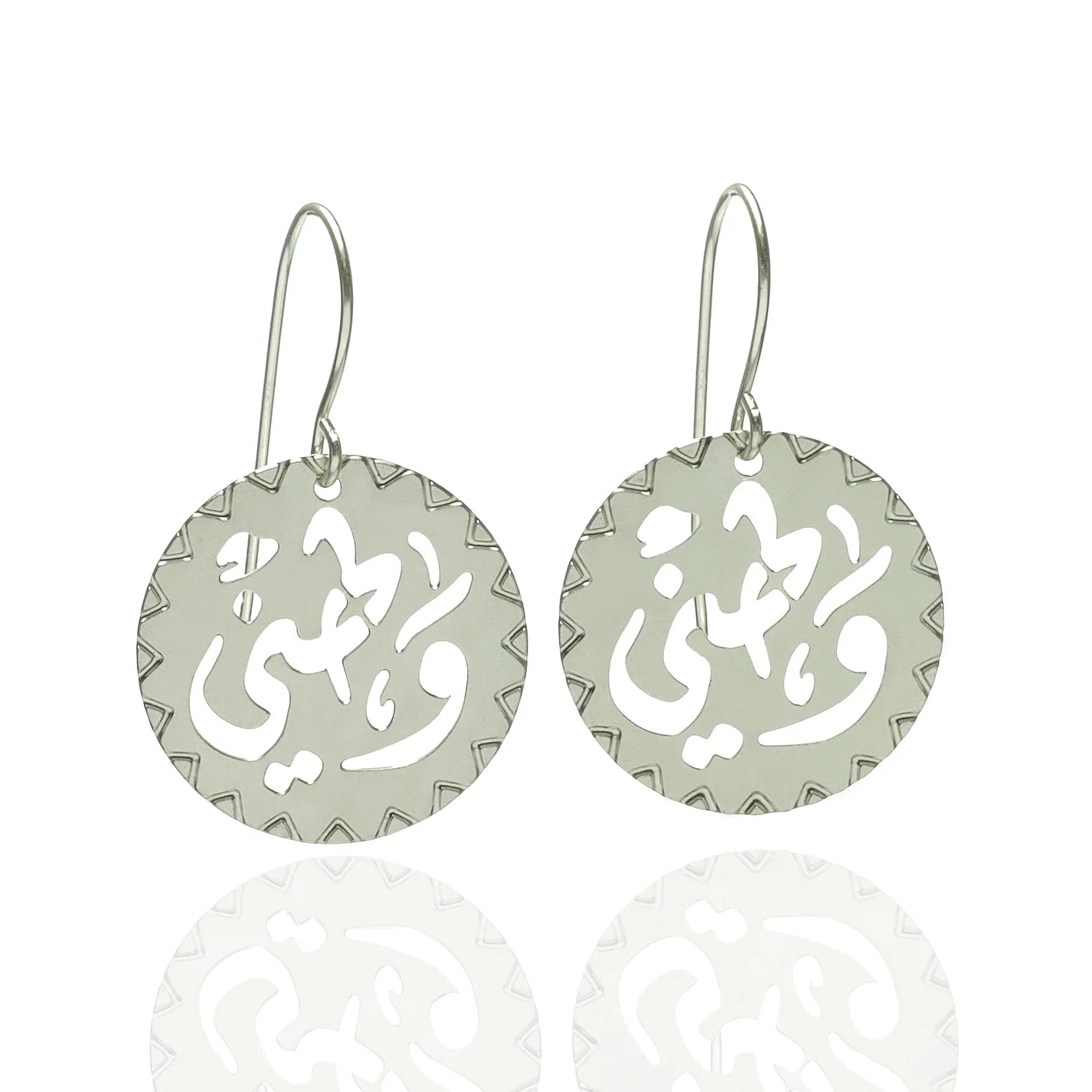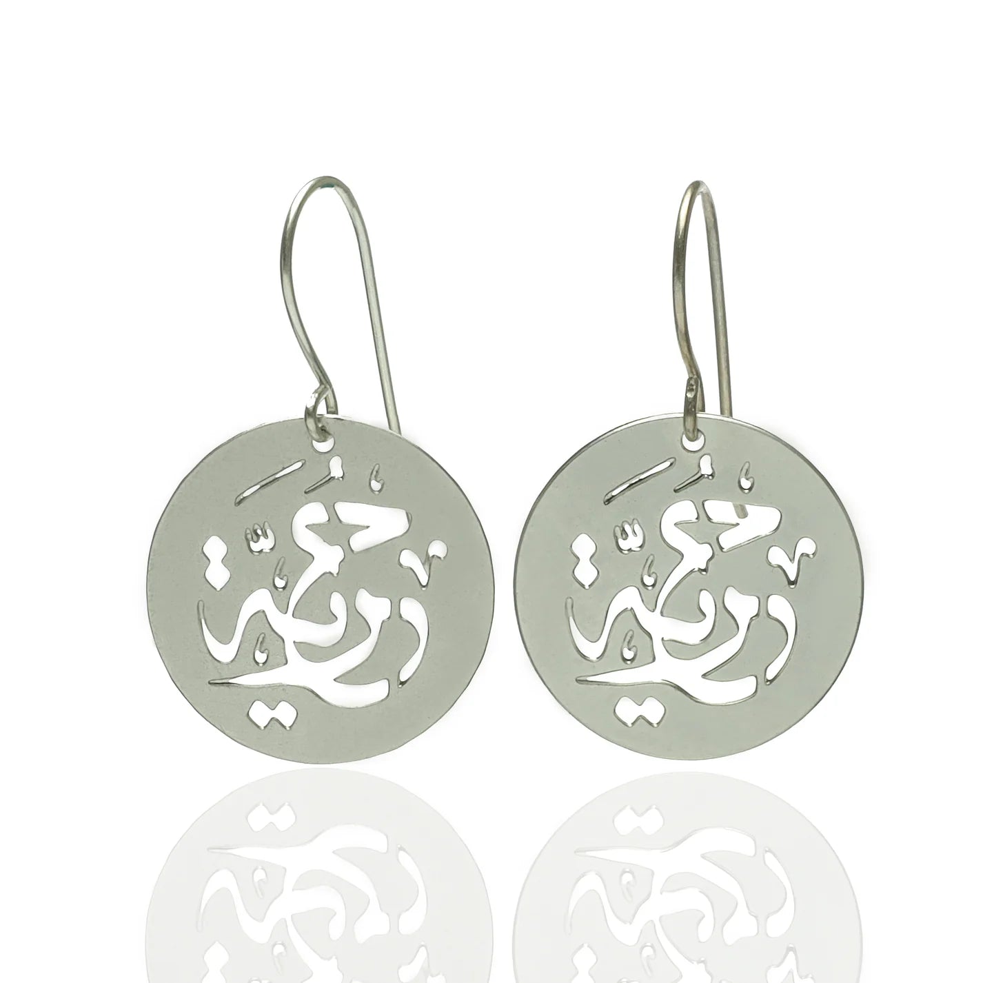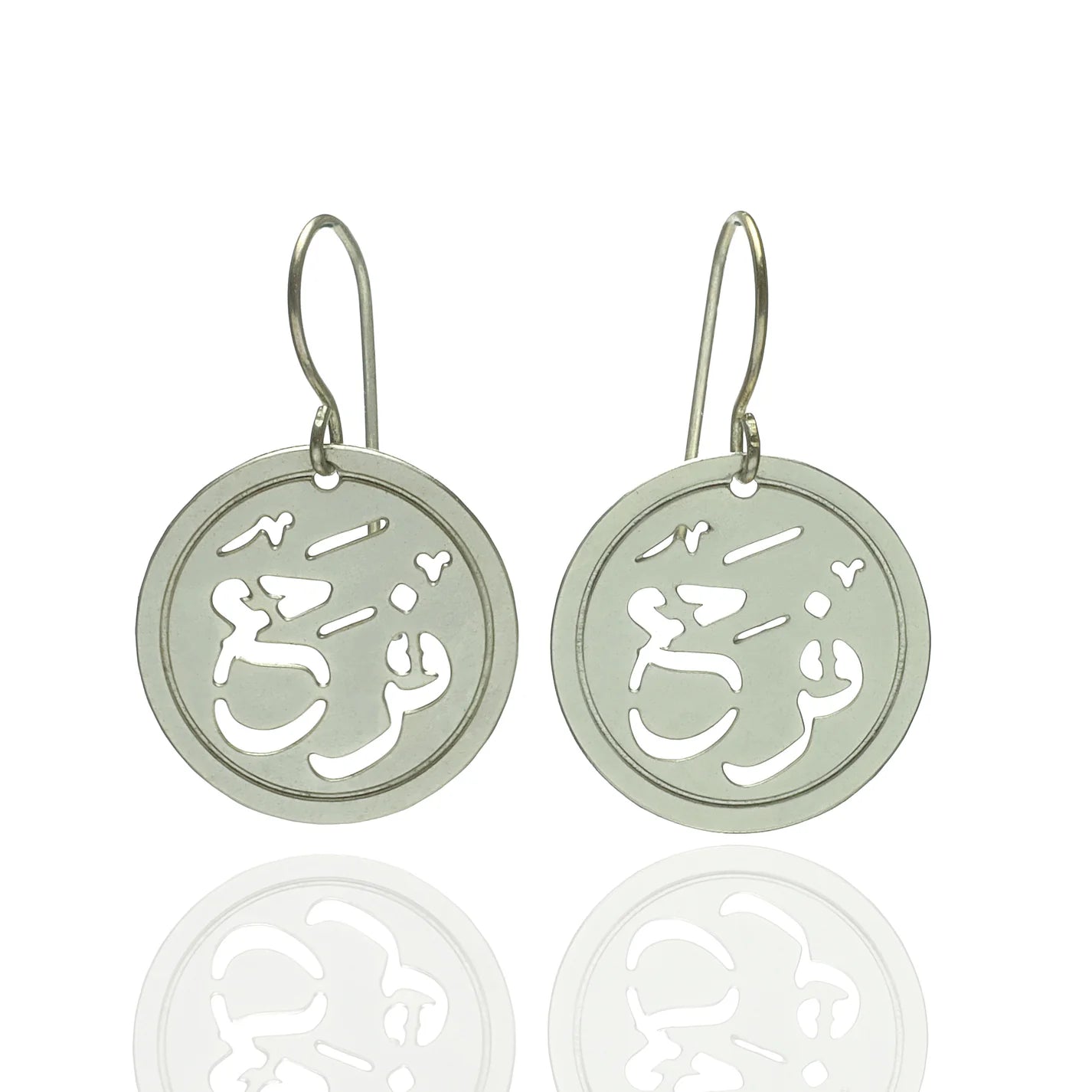 Silver plated calligraphy circle earrings by Gadeer Design that come in two different sizes that are perfect for any occasion.