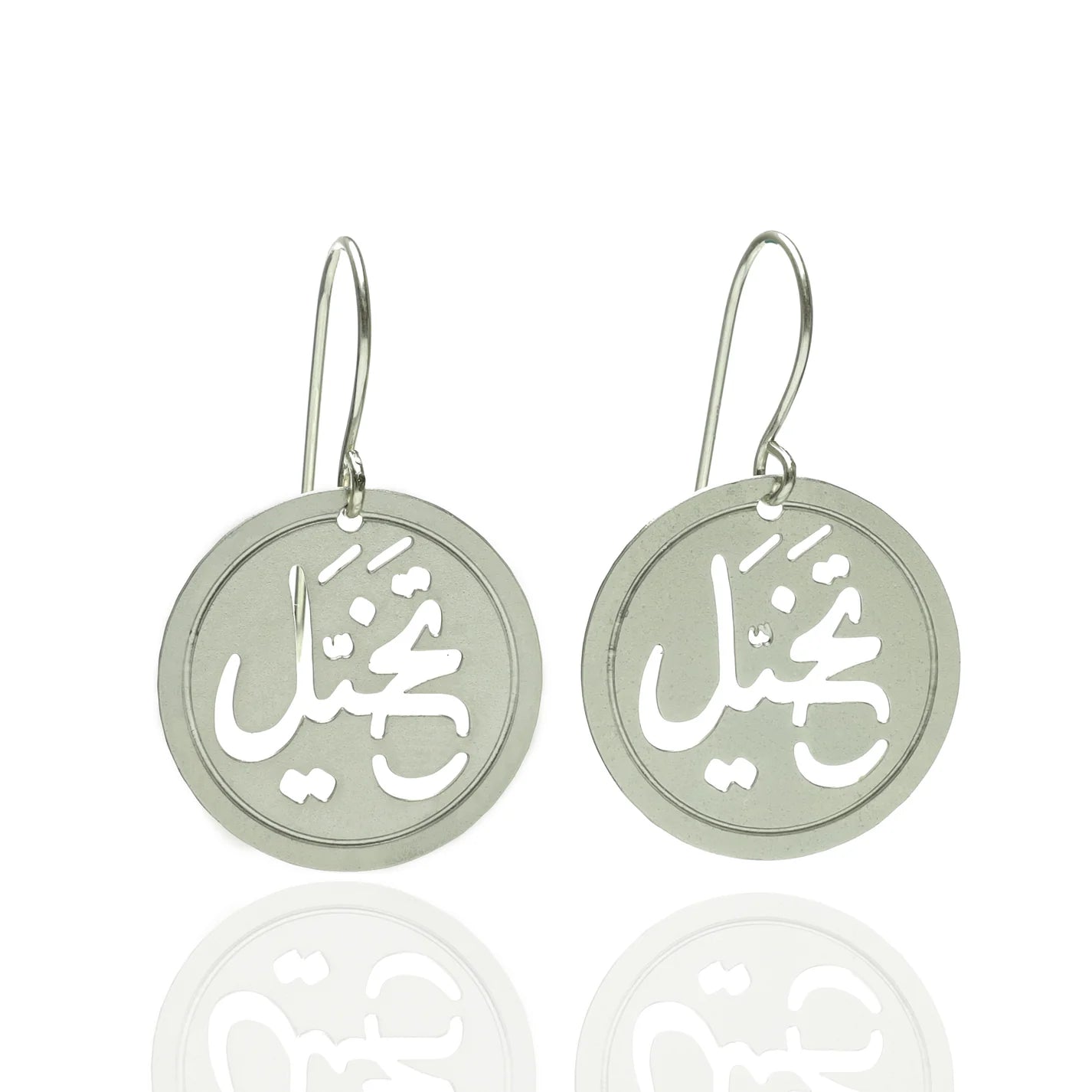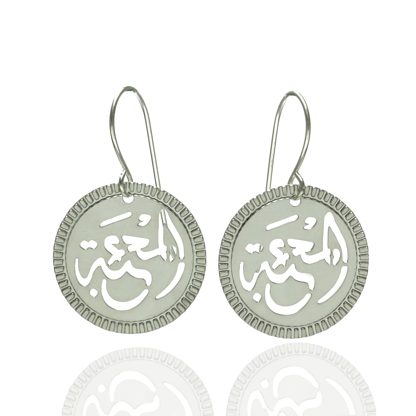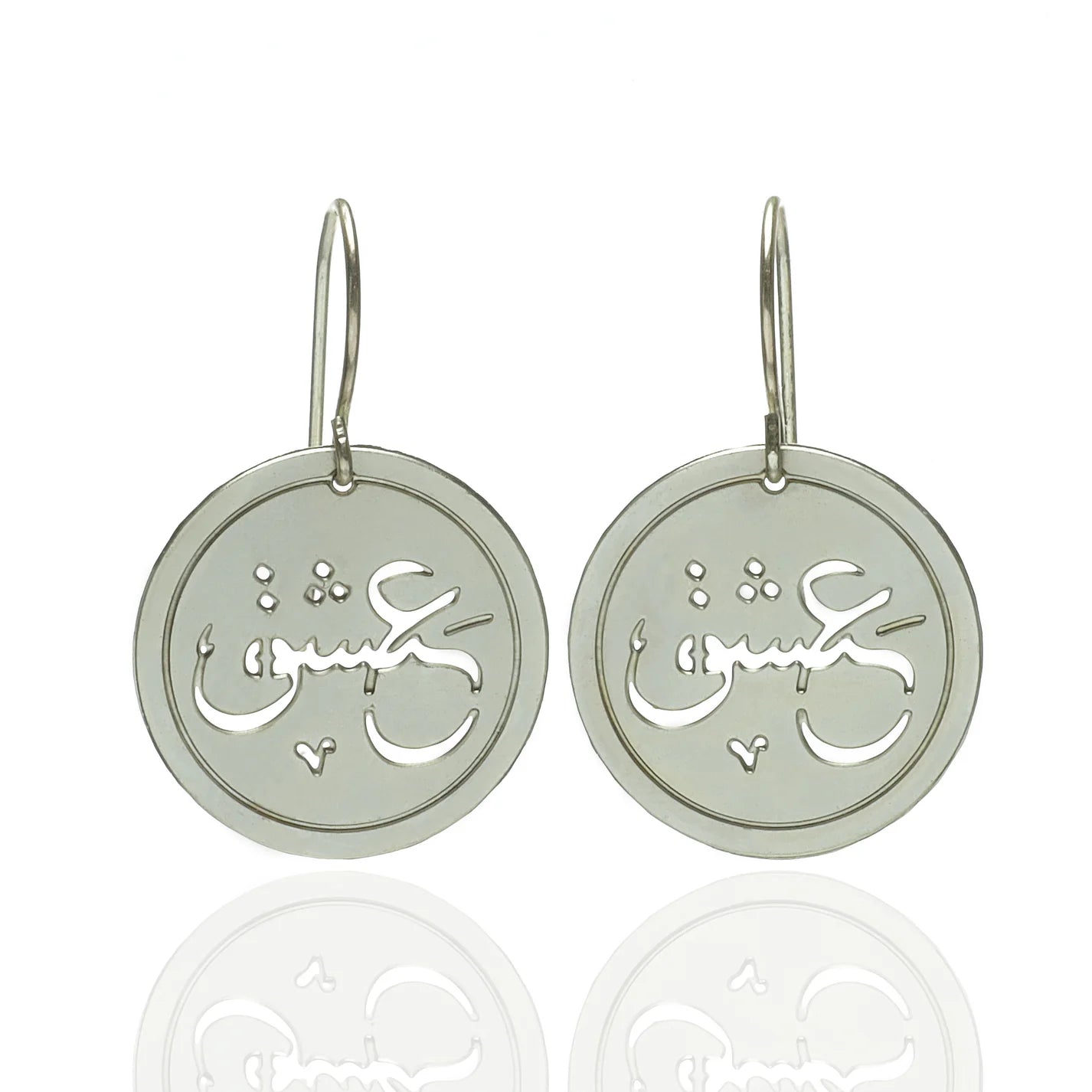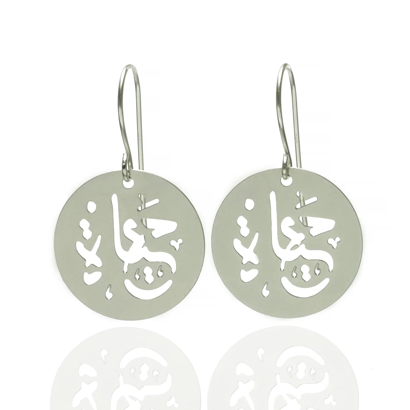 Silver plated calligraphy circle earrings by Gadeer Design that come in two different sizes that are perfect for any occasion.